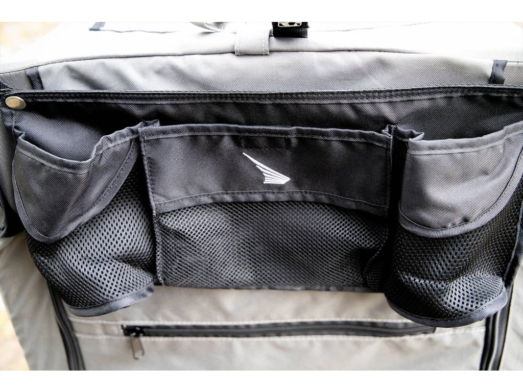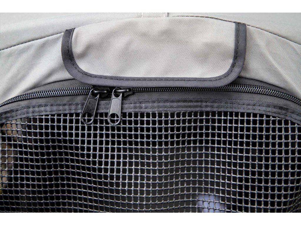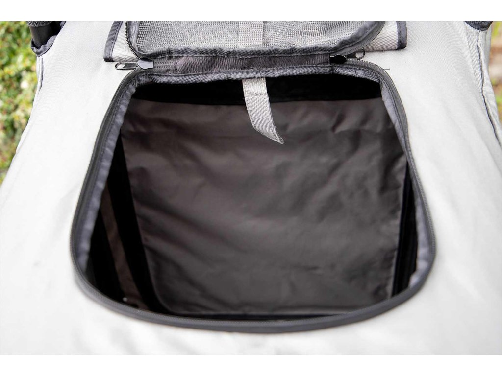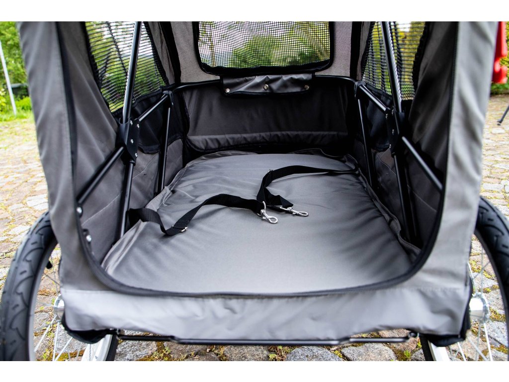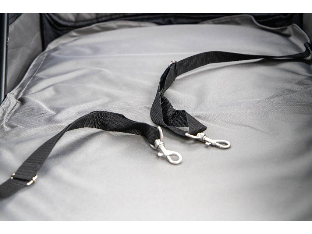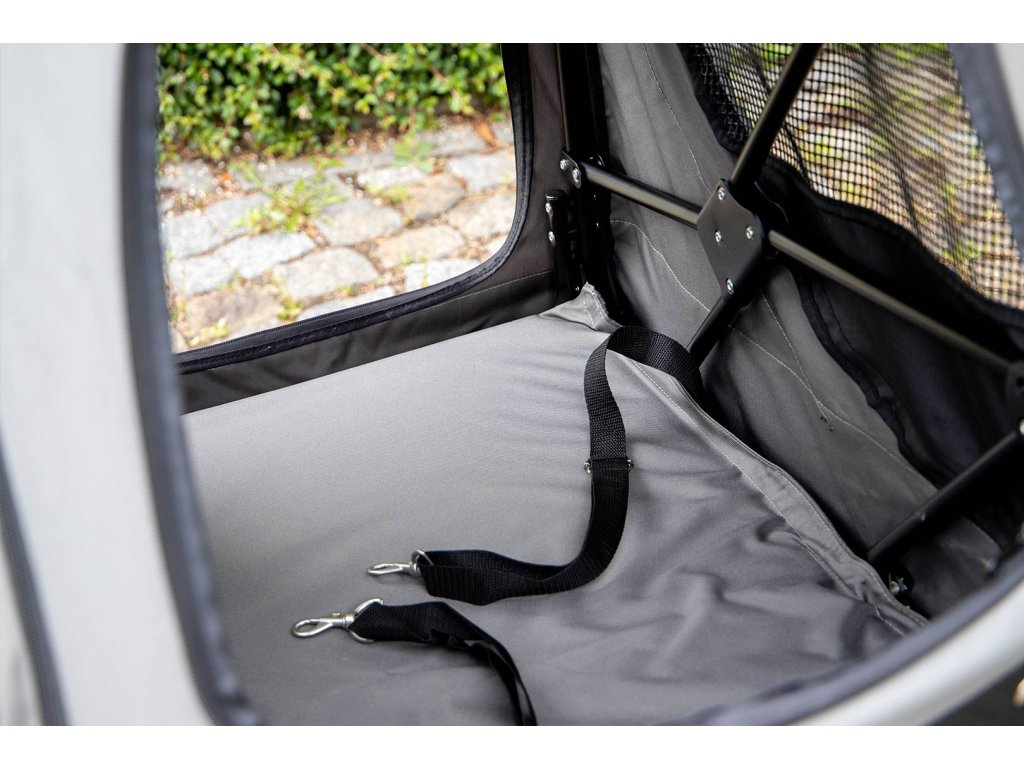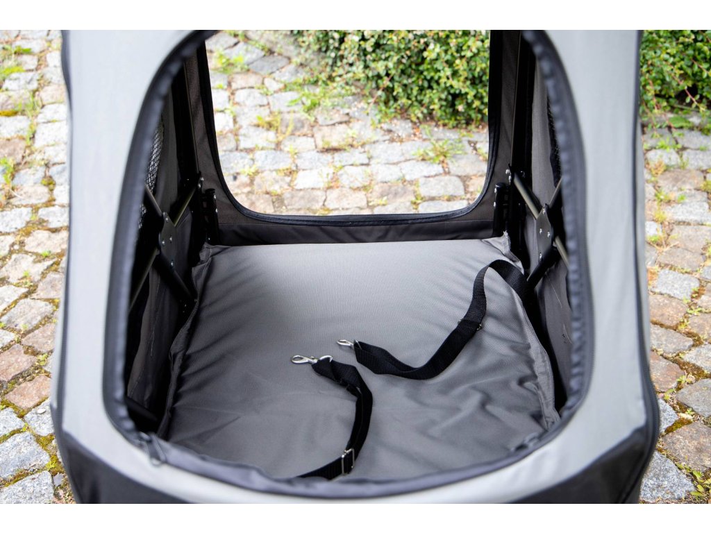 Kočárek vyniká extra prostornou kabinou o rozměrech 85 × 55 × 60 cm (h × š × v) a je tak vhodný pro přepravu i více psů najednou. Síťované přední, horní a boční strany poskytují dostatek výhledu i čerstvého vzduchu, přední a horní síťku lze navíc rozepnout. Rozepínací jsou i celá zadní i přední strana kabiny pro snadný nástup nebo manipulaci s převáženými psy. Uvnitř najdete pevnou vyjímatelnou podložku a dva popruhy s karabinou na připoutání psů v kabince.