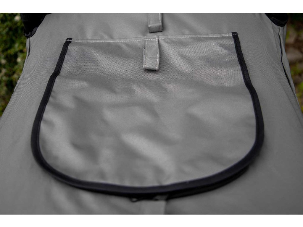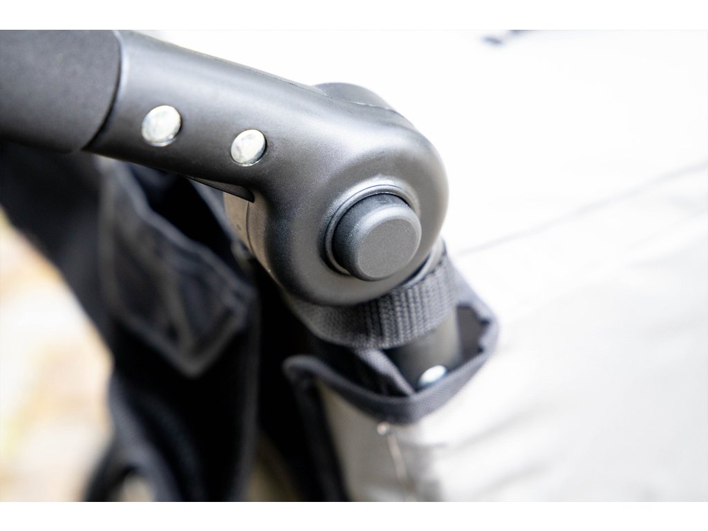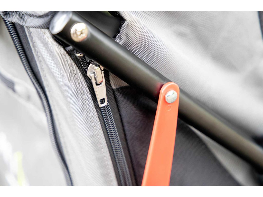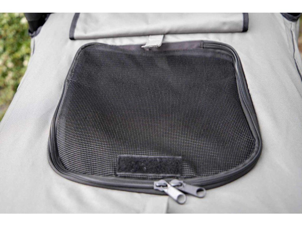Při mírném dešti můžete horní síťku jednoduše zakrýt, při delším dešti přijde vhod pláštěnka na kočár (není součástí). Drobné předměty najdou své místo ve třech menších odepínacích kapsách na zadní straně a jedné velké se zapínáním na zip.
