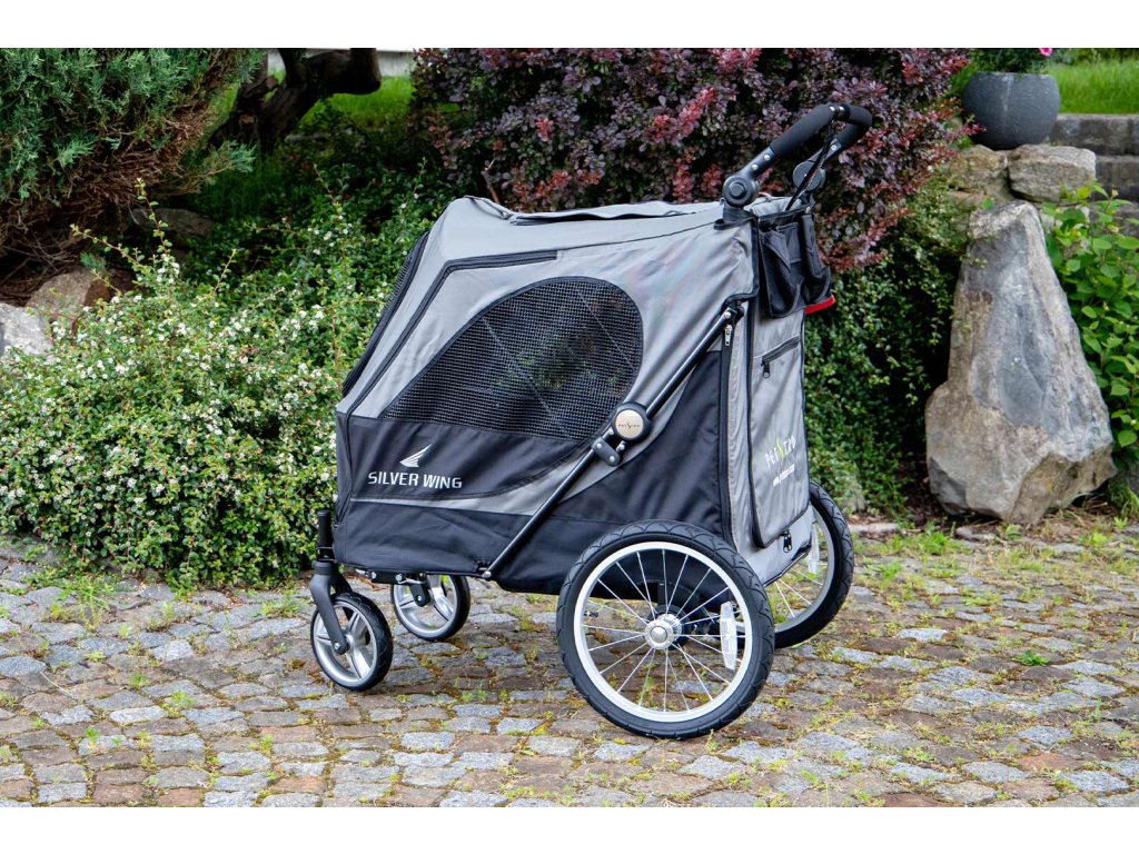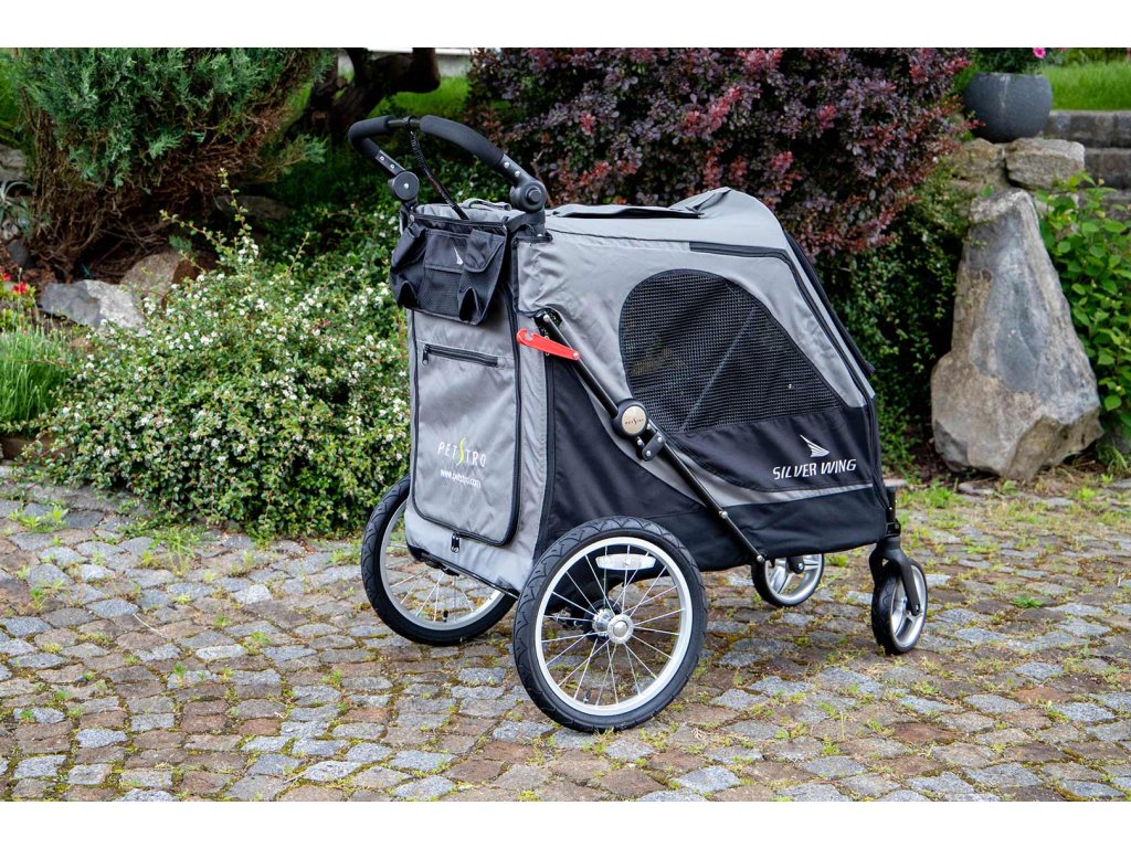 Kočárek pro psy SILVER WING s nosností 55 kg patří k největším kočárkům pro psy na trhu při zachování kompaktních rozměrů a snadné ovladatelnosti. PetStro SILVER WING je čtyřkolý kočárek s komfortními nafukovacími zadními kolečky pro snadné zdolávání i náročnějšího terénu a hladkou jízdu i na hrubém povrchu.