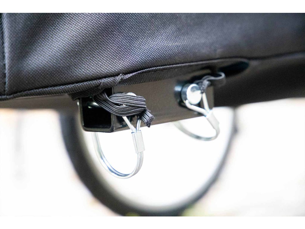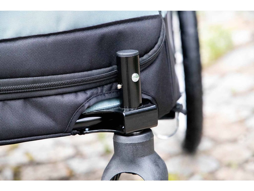 Při mírném dešti můžete horní síťku jednoduše zakrýt, při delším dešti přijde vhod pláštěnka na kočár (není součástí). Drobné předměty najdou své místo ve třech menších odepínacích kapsách na zadní straně a jedné velké se zapínáním na zip.