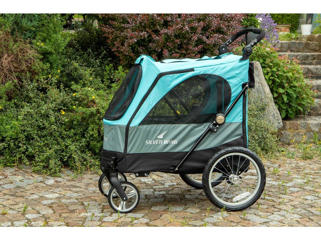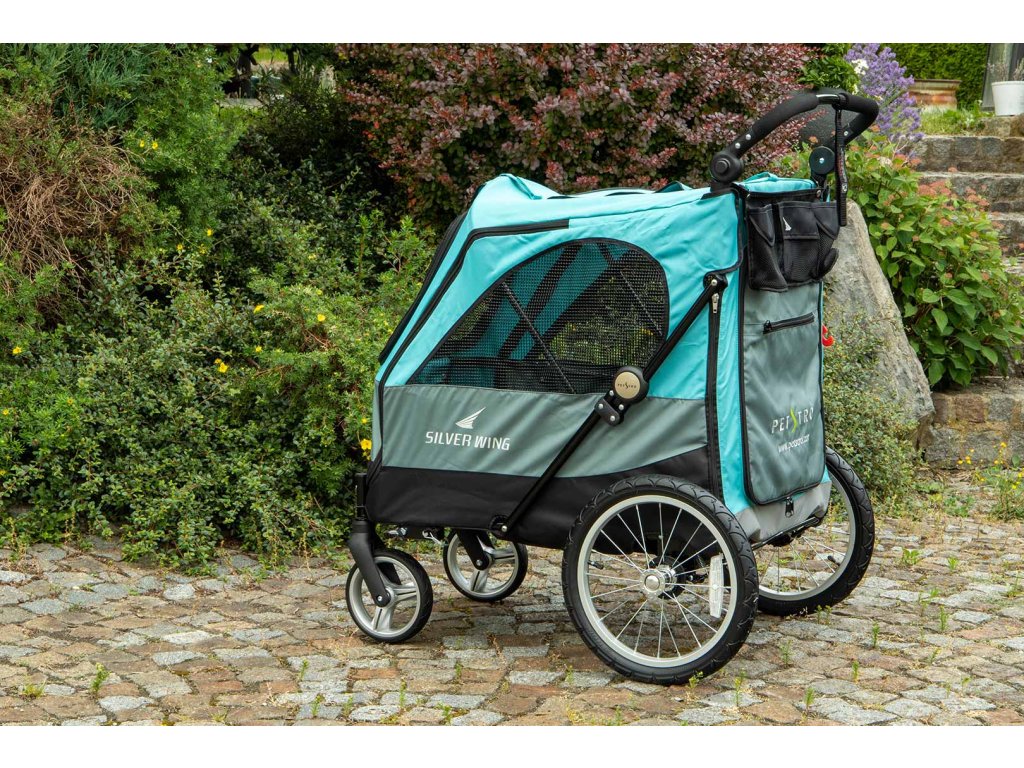 Kočárek pro psy SILVER WING s nosností 55 kg patří k největším kočárkům pro psy na trhu při zachování kompaktních rozměrů a snadné ovladatelnosti. PetStro SILVER WING je čtyřkolý kočárek s komfortními nafukovacími zadními kolečky pro snadné zdolávání i náročnějšího terénu a hladkou jízdu i na hrubém povrchu.