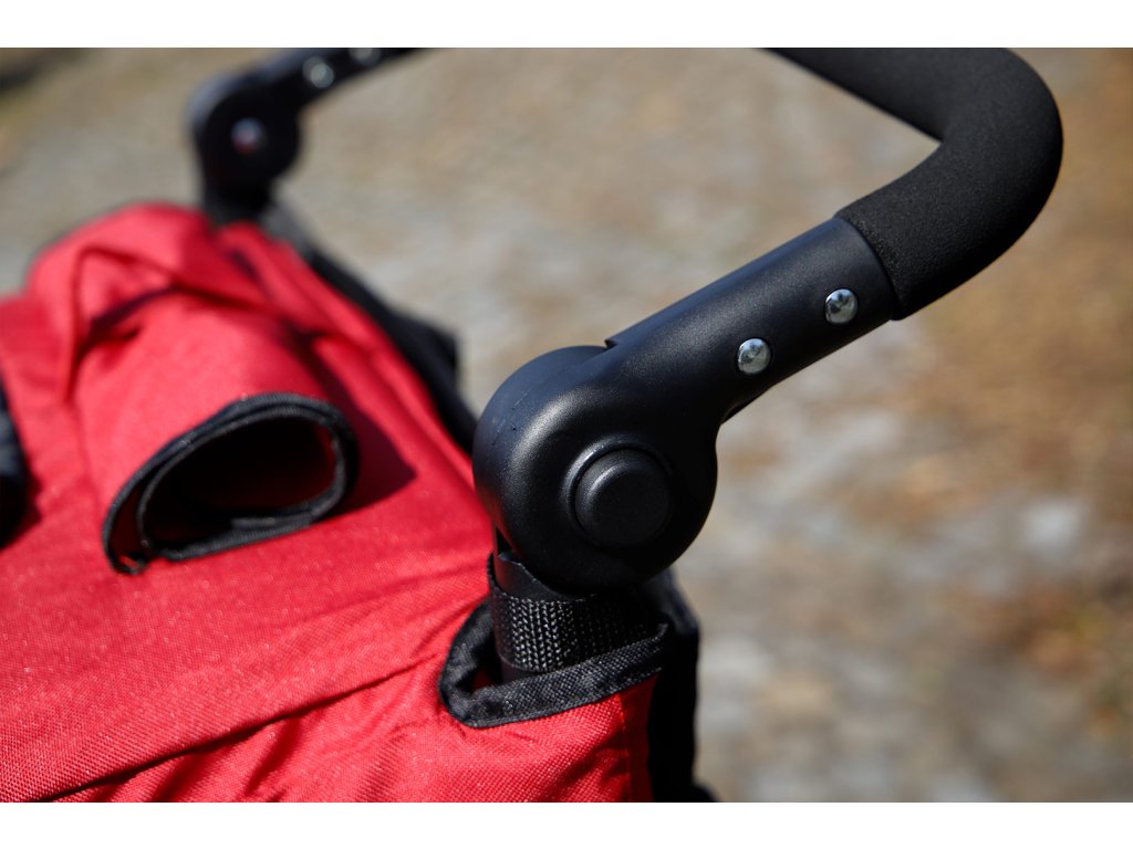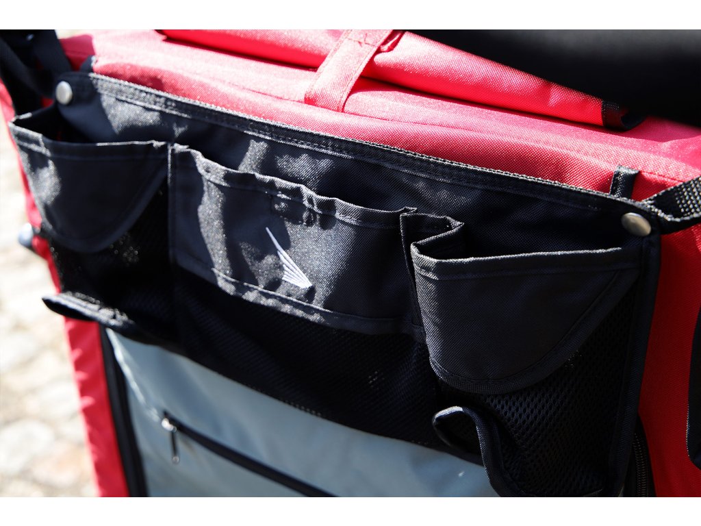 Při mírném dešti můžete horní síťku jednoduše zakrýt, při delším dešti přijde vhod pláštěnka na kočár (není součástí). Drobné předměty najdou své místo ve třech menších odepínacích kapsách na zadní straně a jedné velké se zapínáním na zip.