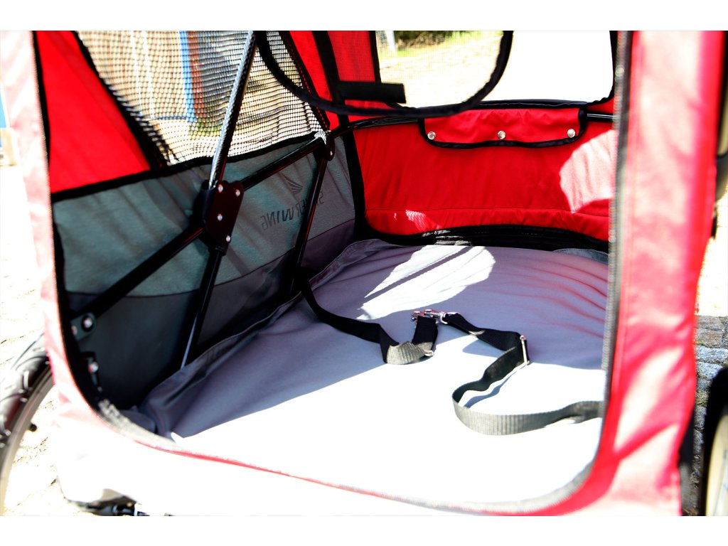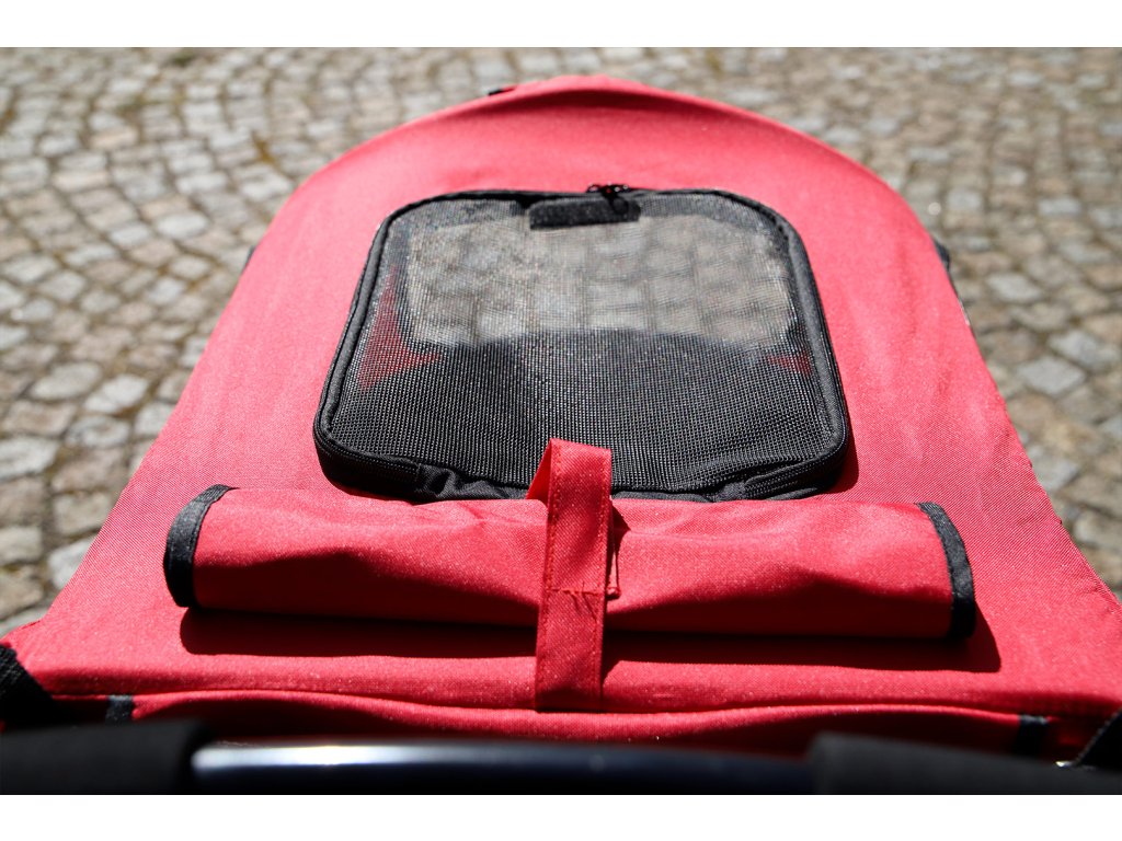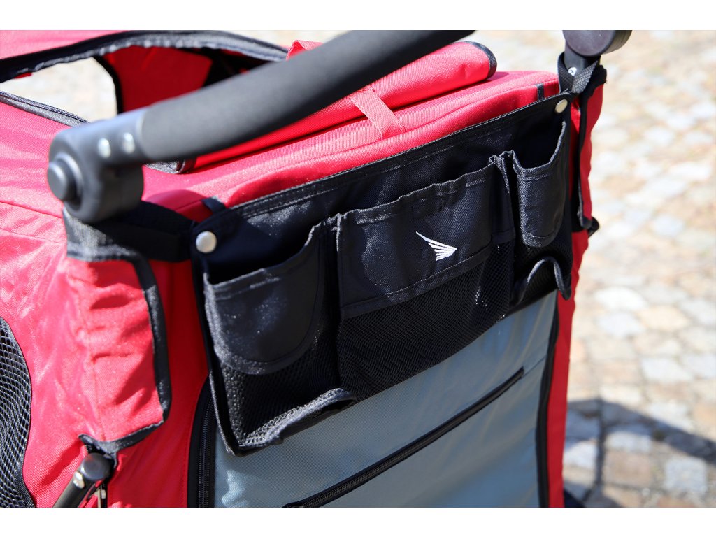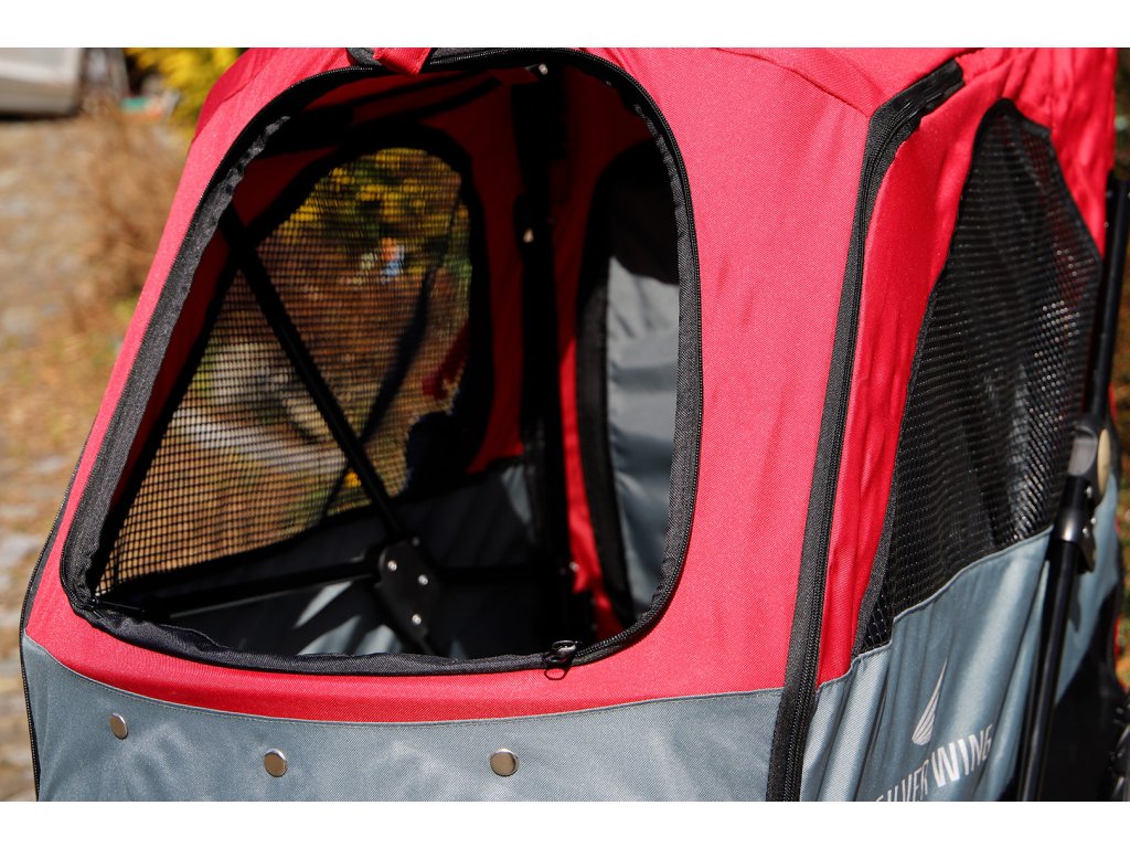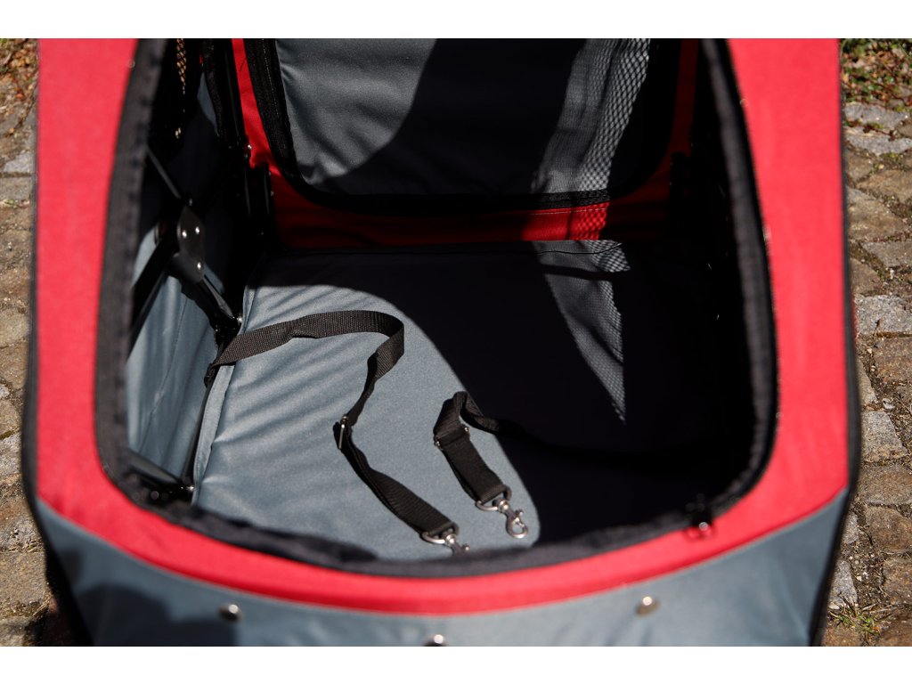 Kočárek vyniká extra prostornou kabinou o rozměrech 85 × 55 × 60 cm (h × š × v) a je tak vhodný pro přepravu i více psů najednou. Síťované přední, horní a boční strany poskytují dostatek výhledu i čerstvého vzduchu, přední a horní síťku lze navíc rozepnout. Rozepínací jsou i celá zadní i přední strana kabiny pro snadný nástup nebo manipulaci s převáženými psy. Uvnitř najdete pevnou vyjímatelnou podložku a dva popruhy s karabinou na připoutání psů v kabince.