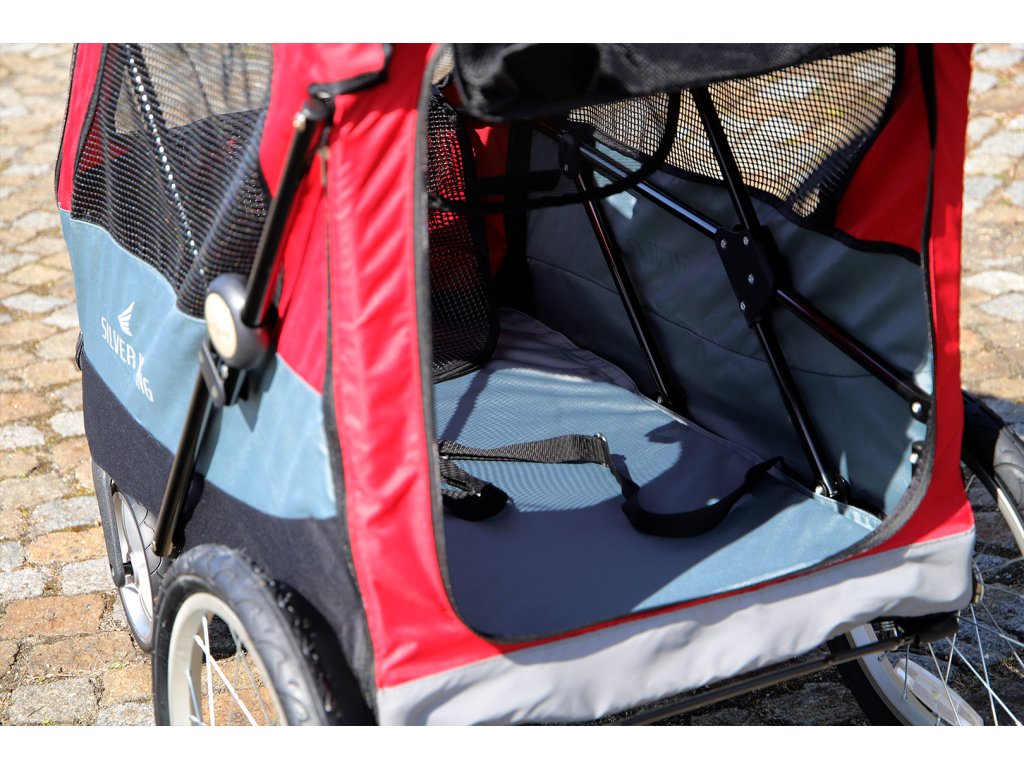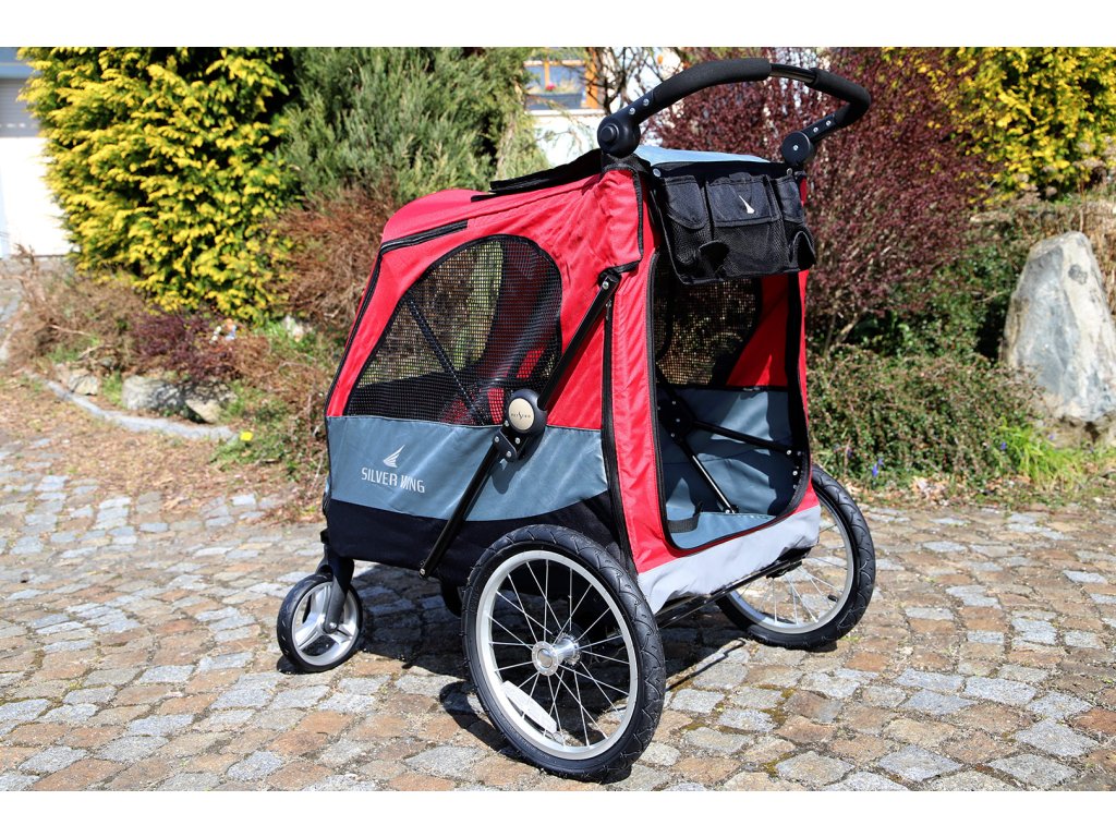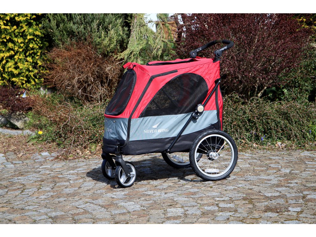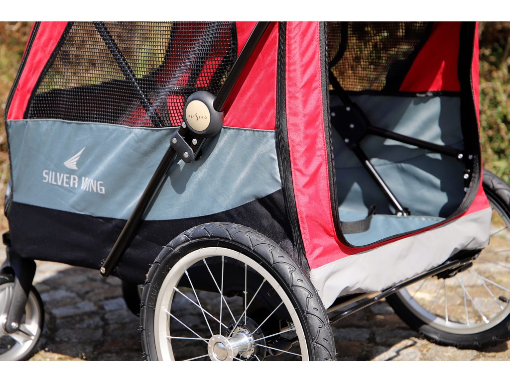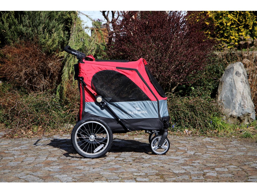 Kočárek pro psy SILVER WING s nosností 55 kg patří k největším kočárkům pro psy na trhu při zachování kompaktních rozměrů a snadné ovladatelnosti. PetStro SILVER WING je čtyřkolý kočárek s komfortními nafukovacími zadními kolečky pro snadné zdolávání i náročnějšího terénu a hladkou jízdu i na hrubém povrchu.