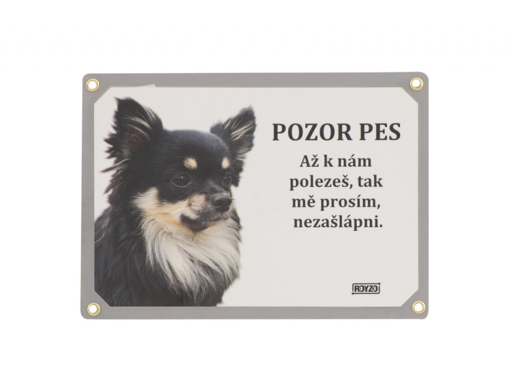 Cedulka POZOR PES – Čivava dlouhosrstá