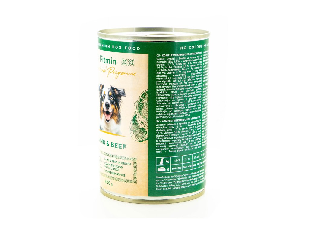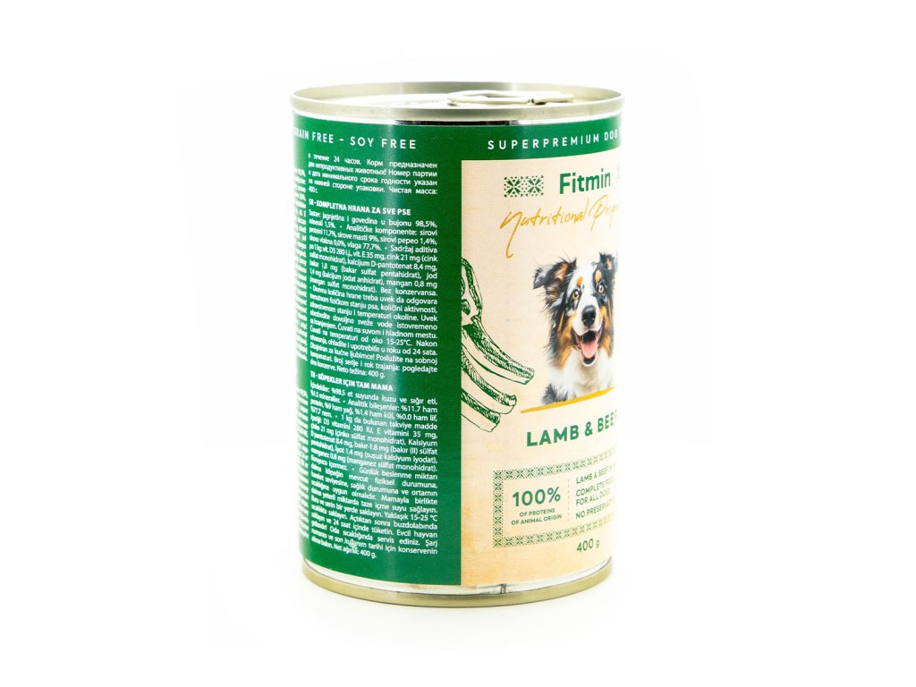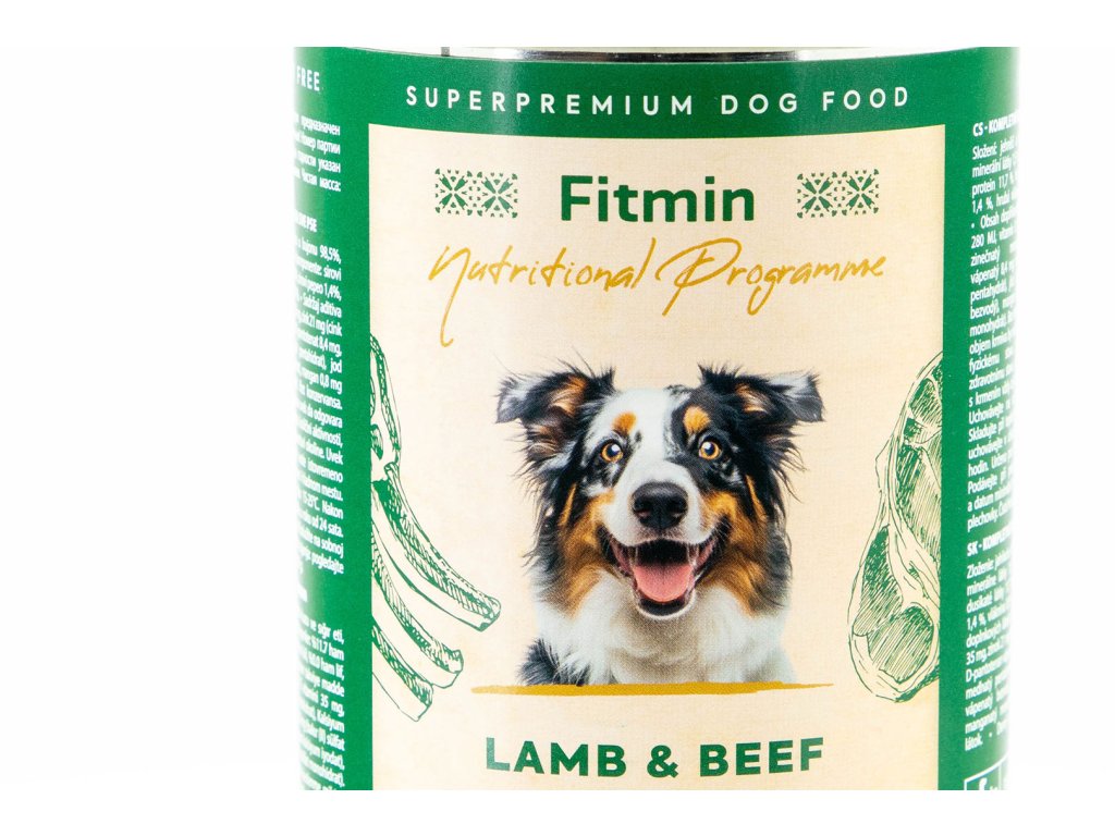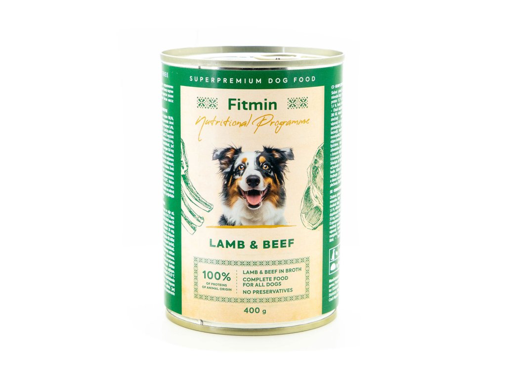 FITMIN konzerva s vysokým obsahem kvalitního jehněčího a hovězího masa je kompletní krmivo určené dospělým psům i štěňatům všech plemen, kterým pokryje všechny potřeby na výživu a energii. Krmivo neobsahuje GMO, obiloviny, sóju ani barviva. Navíc skvěle voní i chutá a váš pes si ho jednoduše zamiluje.