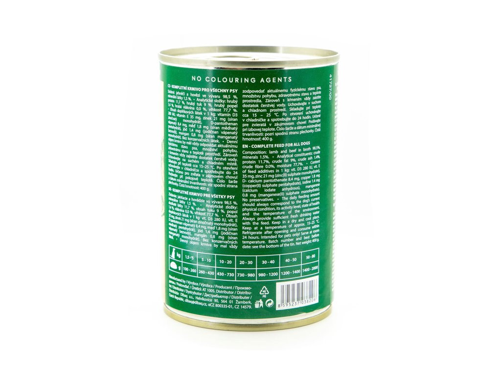 Jehněčí a hovězí maso ve vývaru 98,5 %, minerální látky 1,5 %.