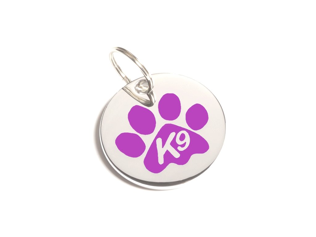 Luxusní identifikační známka pro psy ze stříbrného niklu s glazurovanou fialovou tlapkou a logem K9. Známka je odlehčená, rub je určený k vyrytí jména a telefonního čísla pro případ zatoulání psa.