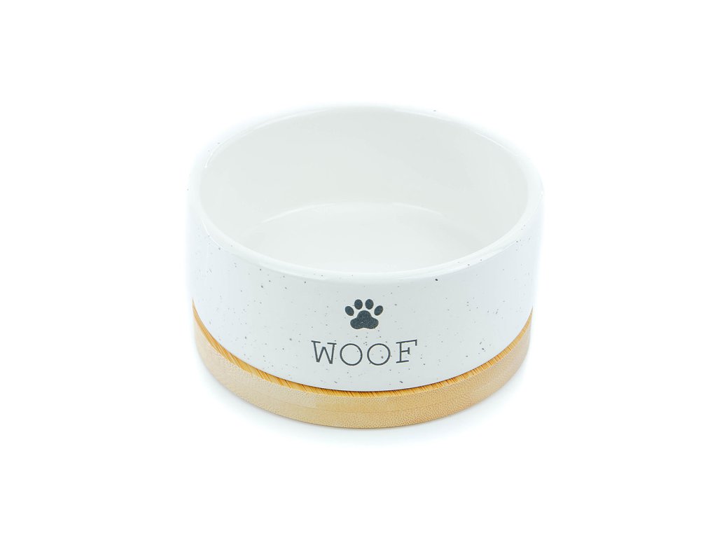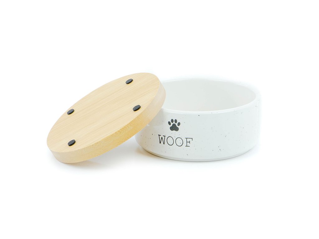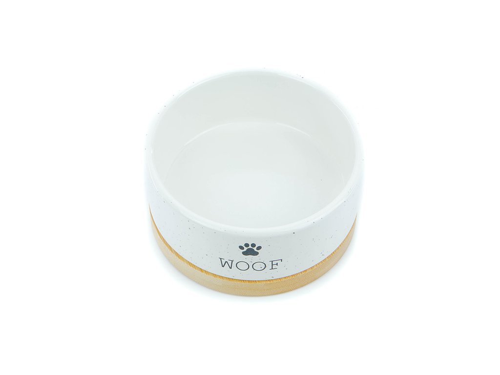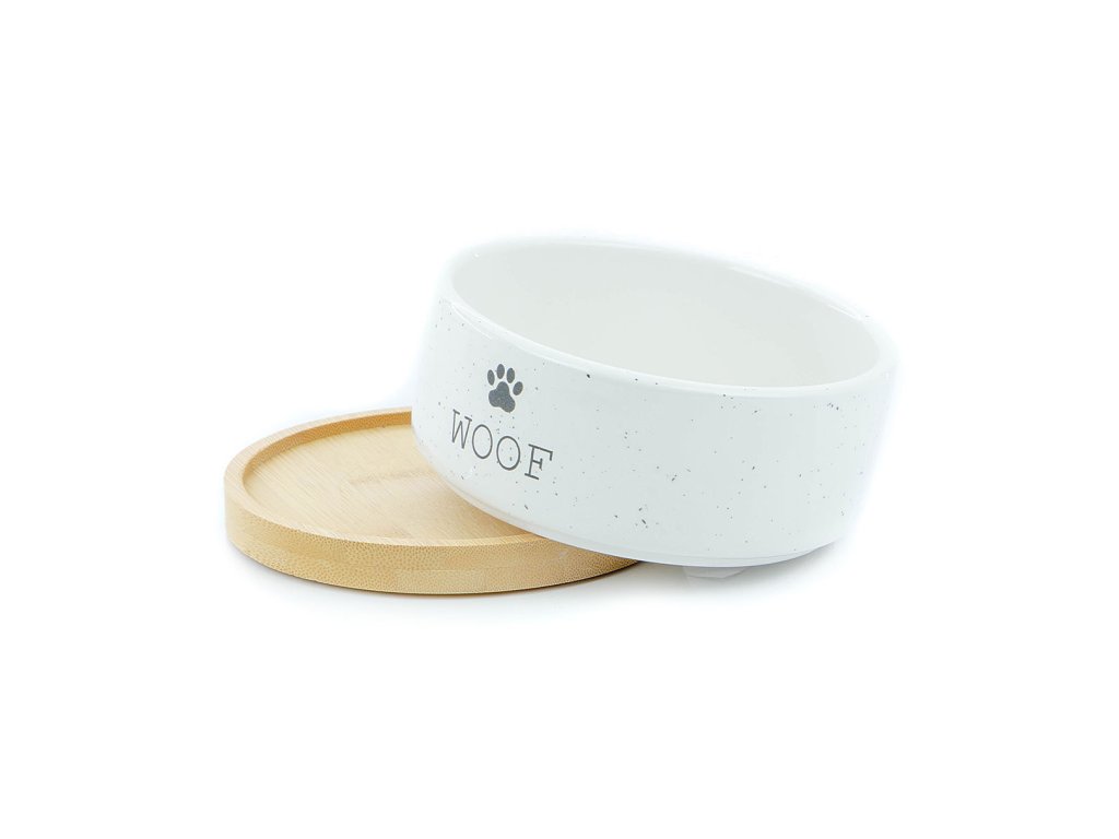 Stylová keramická miska pro velké psy s dřevěnou podložkou vhodná na vodu i krmivo. Protiskluzová úprava podložky, průměr misky 13 cm, výška 5,5 cm.