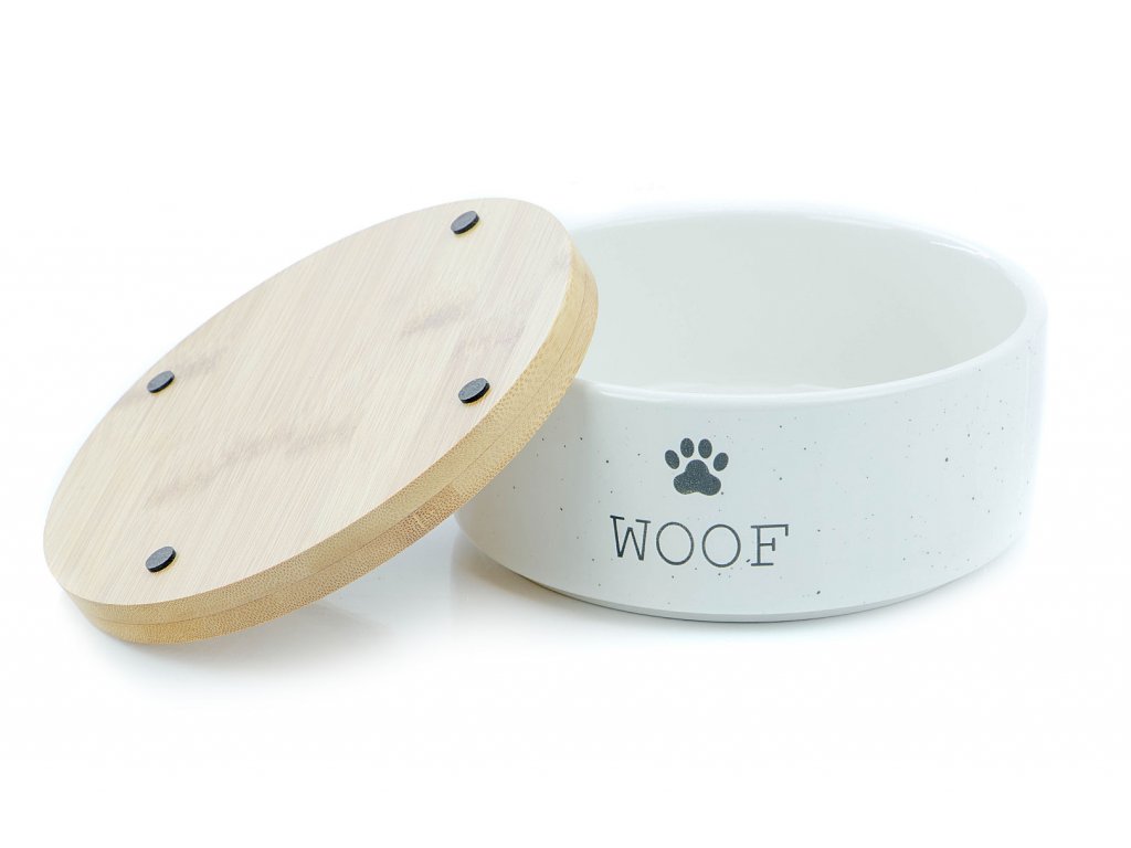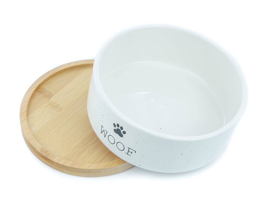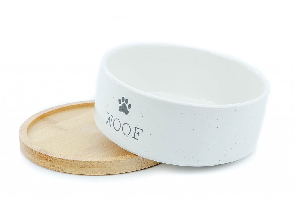Stylová keramická miska pro velké psy s dřevěnou podložkou vhodná na vodu i krmivo. Protiskluzová úprava podložky, průměr misky 16,5 cm, výška 6,5 cm.