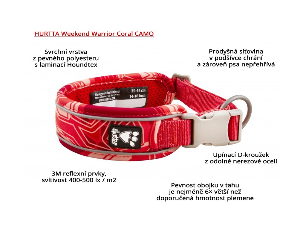Obojek Hurtta Weekend Warrior je opatřen 3M reflexním potiskem a reflexními lemy zlepšujícími viditelnost vašeho psa ve tmě, jezdec umožňuje pohodlné nastavení velikosti obojku v rozsahu uvedeném v tabulce. Nezbytný D-kroužek poslouží k připnutí vodítka a ID známky.