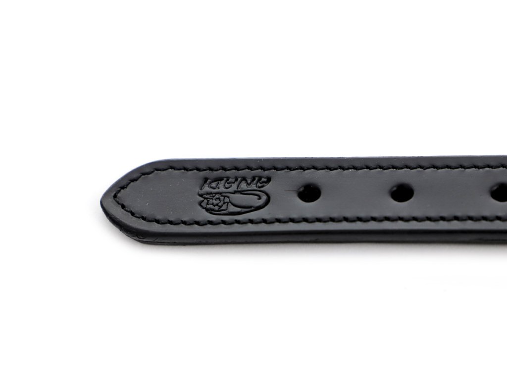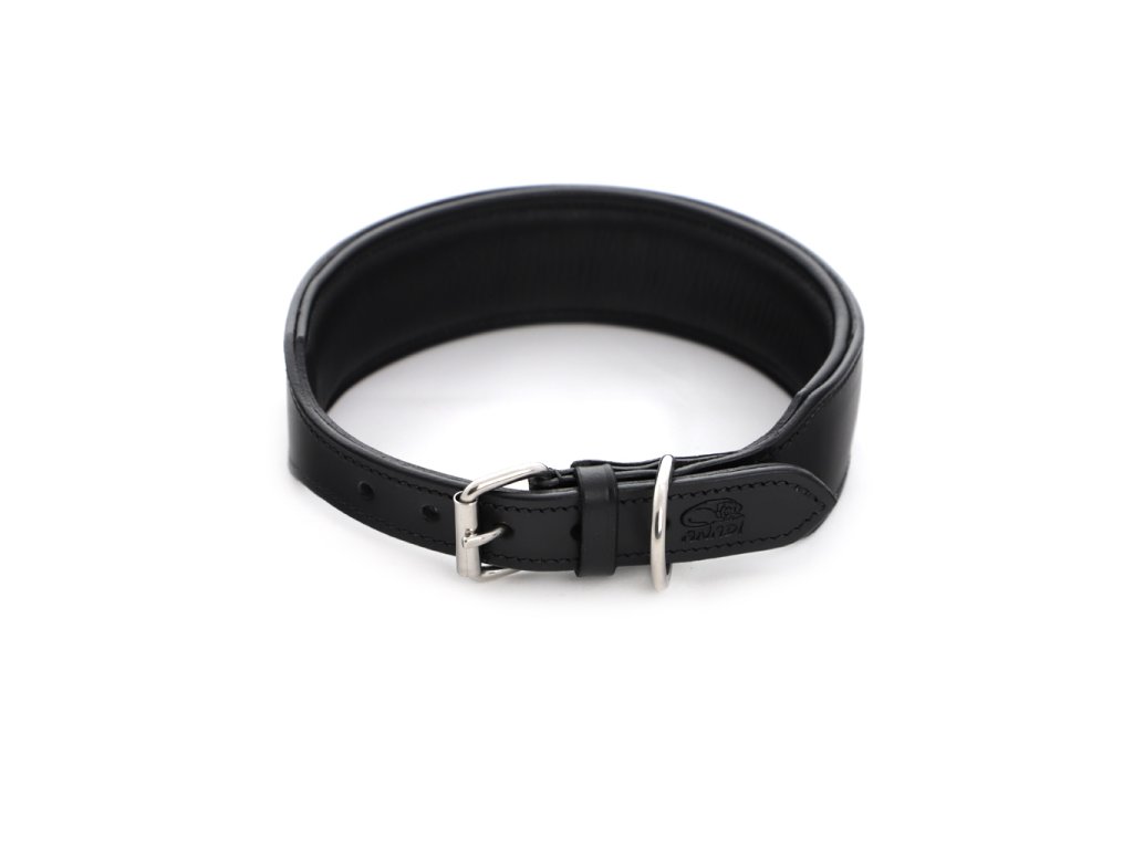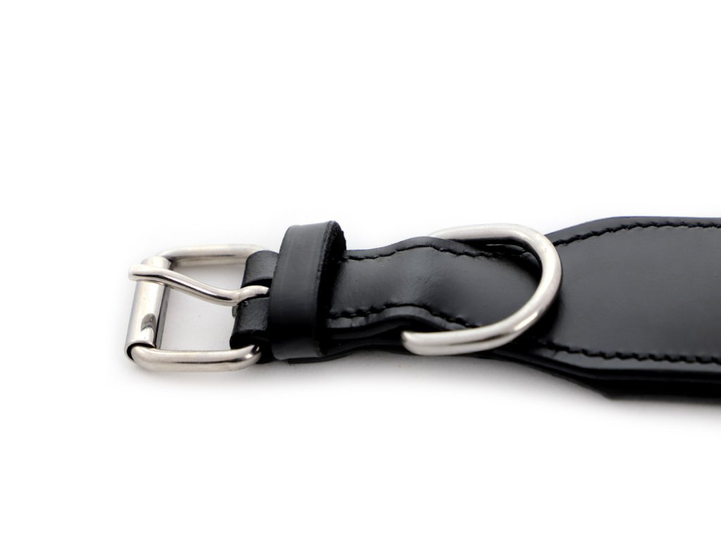 Obojek je opatřený leštěnou kovovou přezkou ve stříbrné barvě.