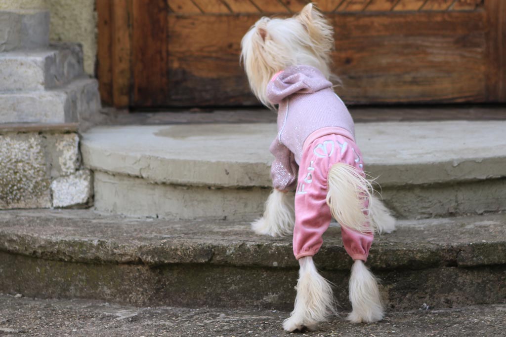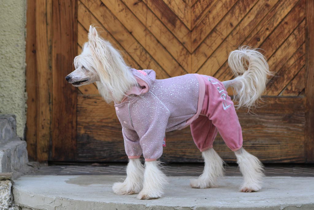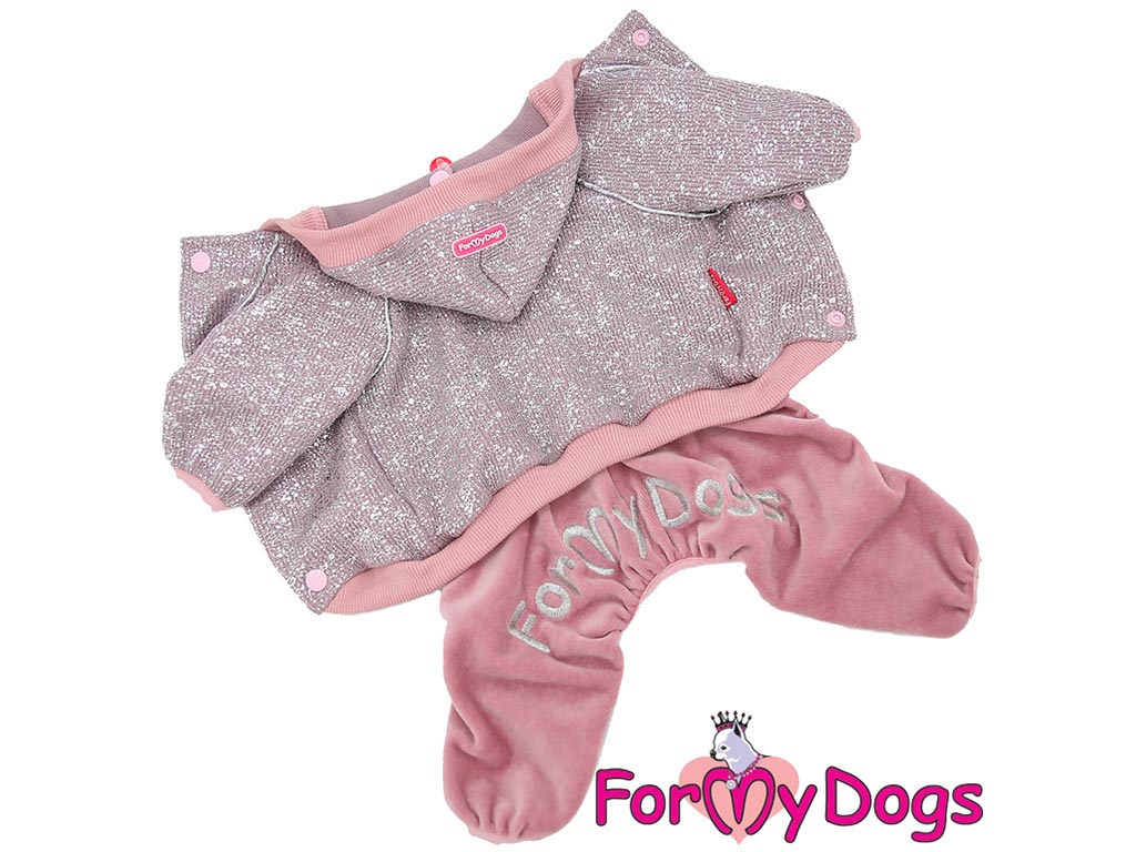 Lehoučký pletený overal z veluru pro psy i fenky od FMD je určený pro chladnější jarní nebo podzimní dny. Overal z jednovrstvého materiálu se zapíná na druky na bříšku, v pase gumička na stažení, na nohavicích pružný lem. Je zdobený stříbrným vyšíváním na kalhotách a zdobením na bundě.