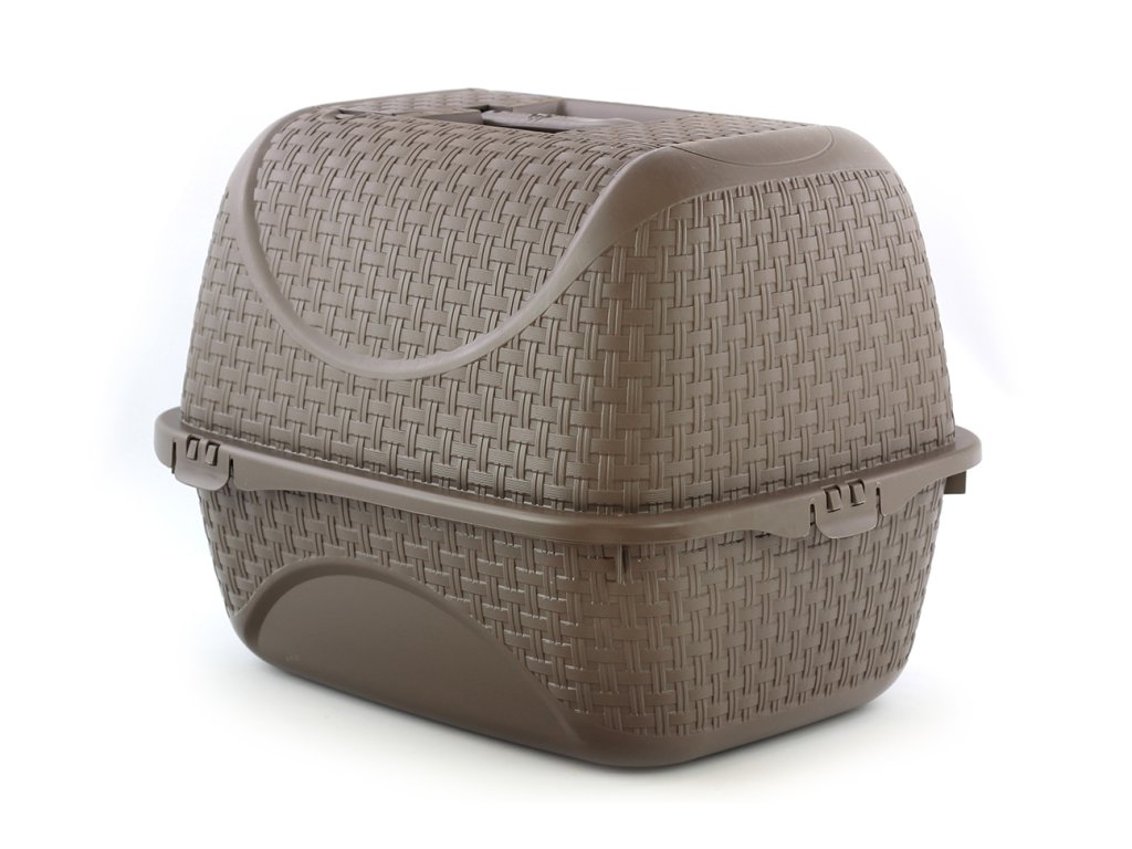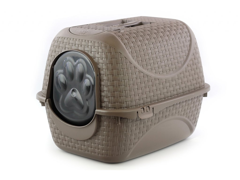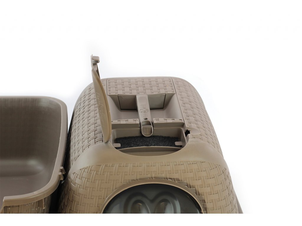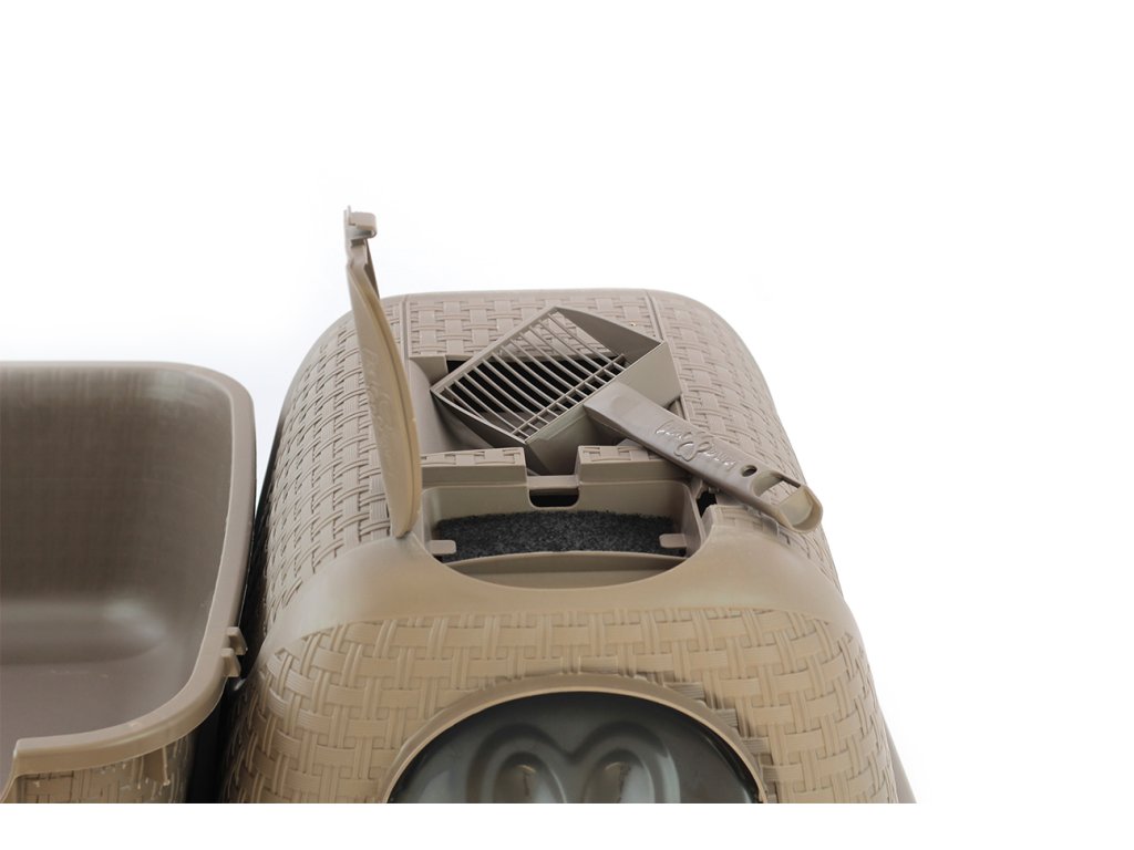 Prostorná krytá toaleta pro kočky z pevného omyvatelného plastu v originálním „proutěném“ designu. Toaleta má zvýšenou základnu pro dostatečné množství kočičího steliva a je opatřená výklopnými průhlednými dvířky pro dokonalé soukromí. O odstranění nepříjemného zápachu se postará výměnný uhlíkový filtr. Toaleta je opatřena úchytem pro snadnou manipulaci.