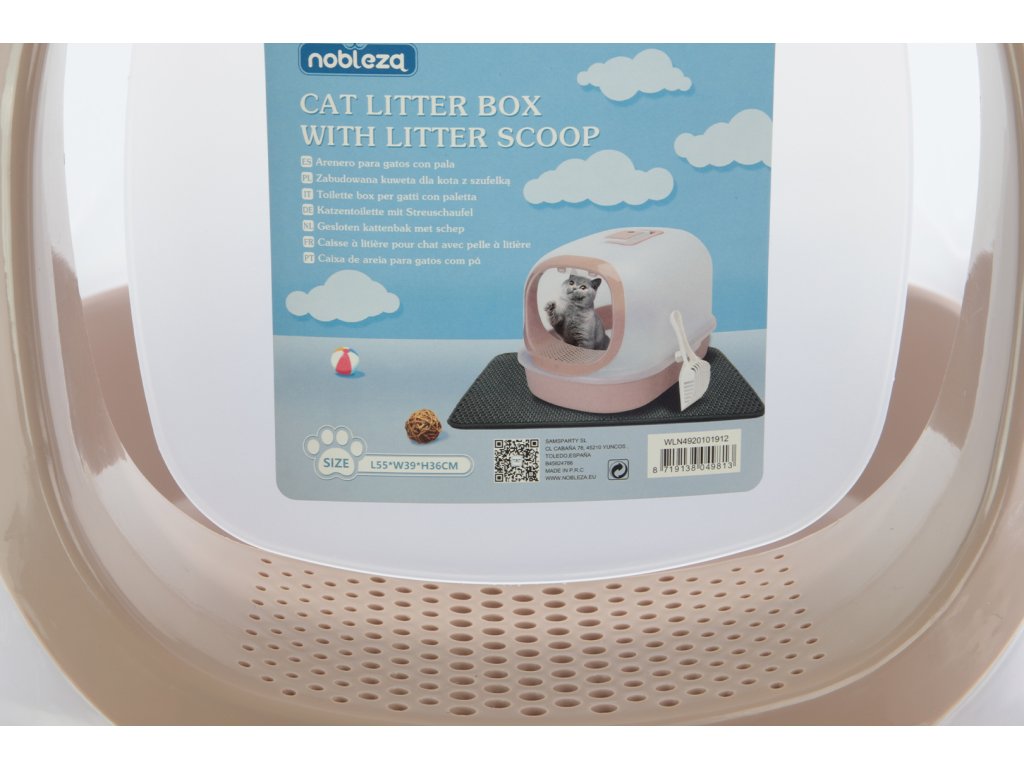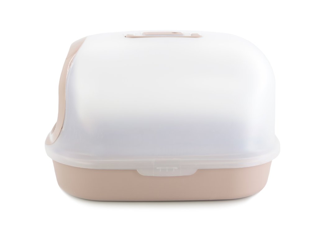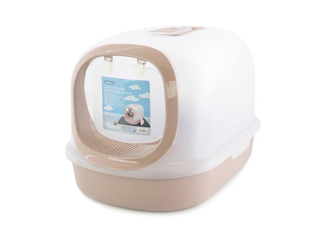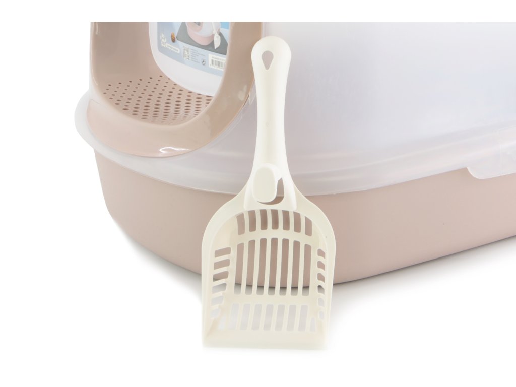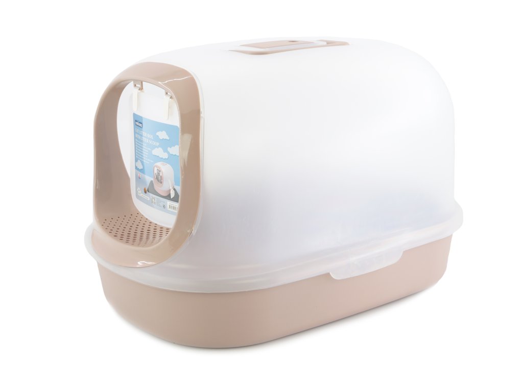 Prostorná krytá toaleta pro kočky z pevného omyvatelného plastu se zvýšenou základnou pro dostatečné množství kočičího steliva. WC je opatřené výklopnými dvířky pro dokonalé soukromí, nástupní otvor je rozšířený a děrovaný pro zamezení vynášení steliva z toalety. Samozřejmostí je i lopatka na exkrementy.