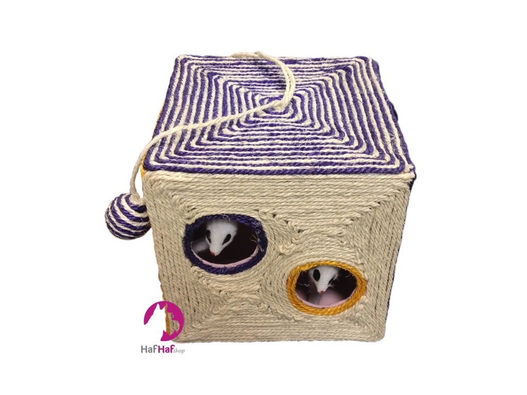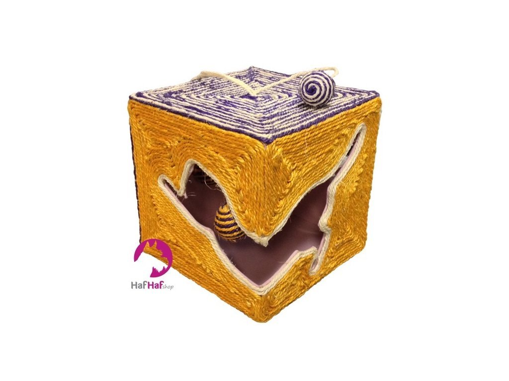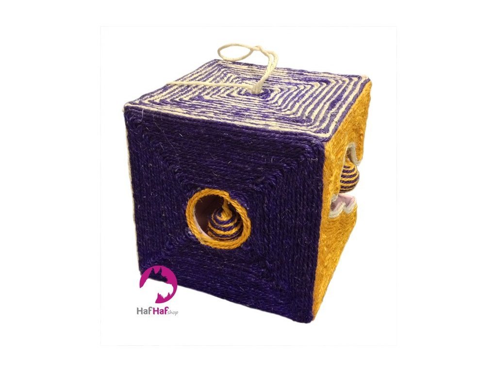 Originální škrabadlo pro kočky ve tvaru kostky s otvory na všech stranách a se šesti zavěšenými hračkami zajistí všem vašim kočkám hodiny a hodiny zábavy. Škrabadlo vyniká velmi pevnou a bytelnou konstrukcí a je vyrobeno z přírodního sisalu, který je velmi příjemný pro kočičí drápky.