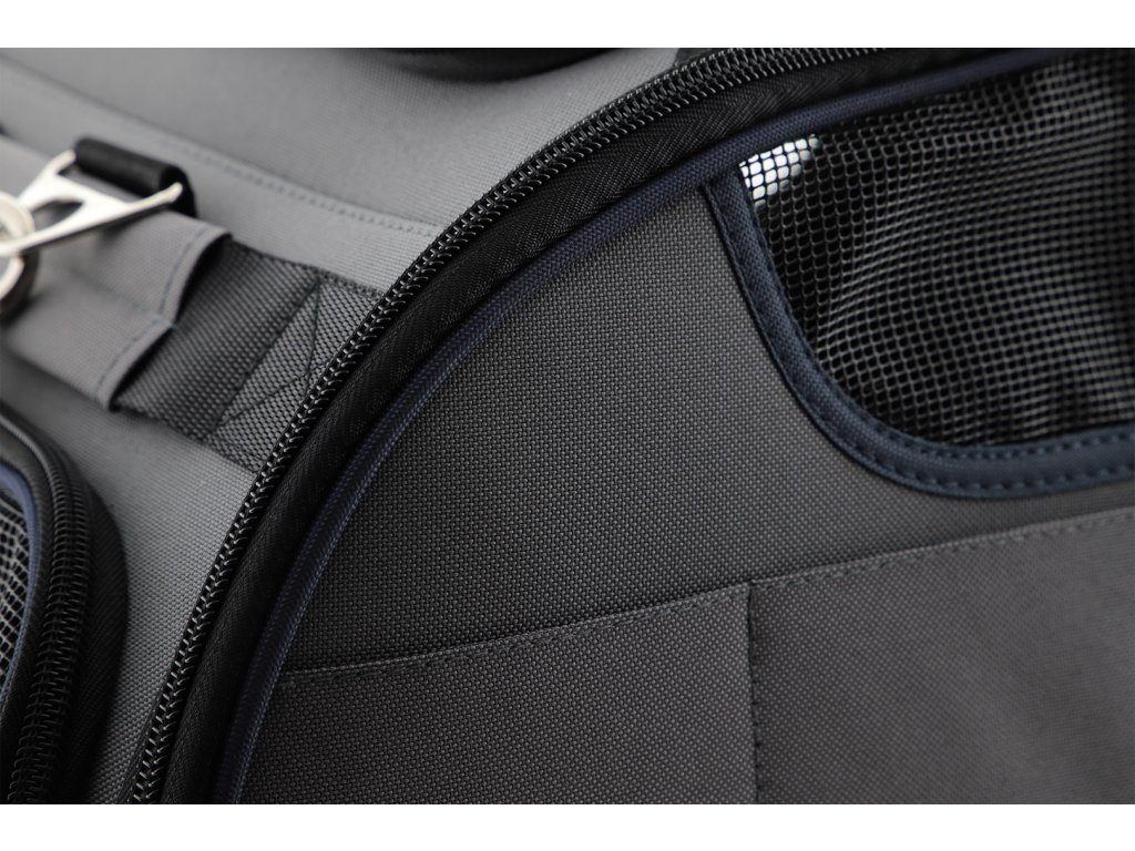 Síťované průzory umožňují psovi sledovat okolí ze všech stran, síťovaná vrchní strana na zip umožňuje kontrolu a přehled nad převáženým pejskem. Uvnitř schránky je bezpečnostní řemínek s karabinkou pro připnutí na postroj nebo obojek převáženého psa a také vyjímatelná podložka.