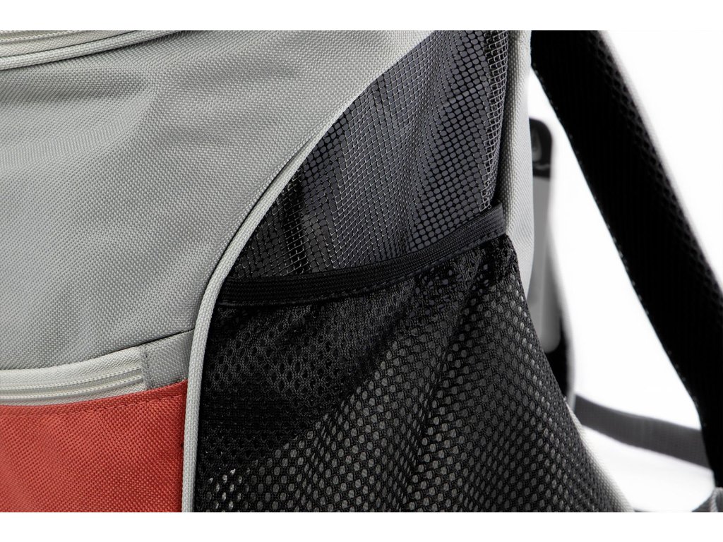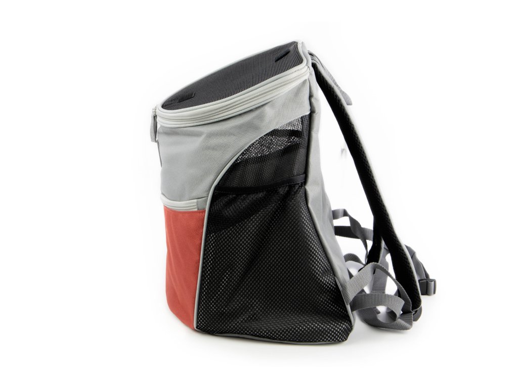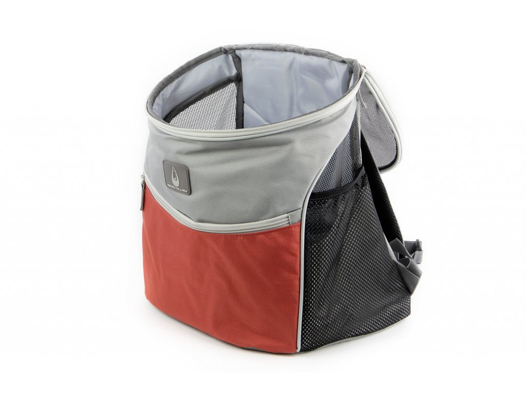 Batoh na psa v decentním červeno-modrém provedení má nosnost 8 kg, která je dostatečná pro štěňata a většinu malých plemen psů. Batoh z pevného materiálu je díky širokým popruhům a nastavitelnému břišnímu pásu vhodný i pro delší cestování, výlety apod.