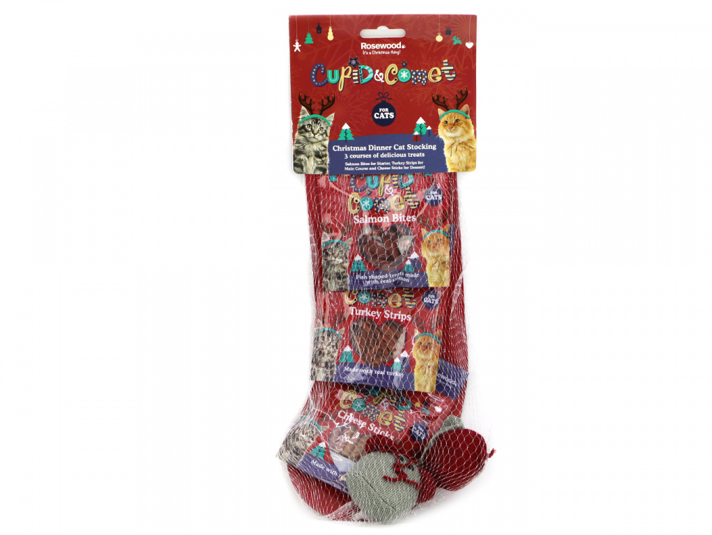 ROSEWOOD přináší dárkový balíček pro kočky plný skvělých pochoutek a hraček. To vše v originálním balení vhodném k zavěšení. Balíček obsahuje tři druhy balených kočičích pochoutek a dvě plyšové myšky plněné catnipem.