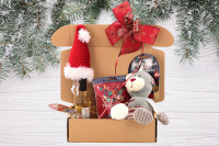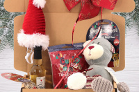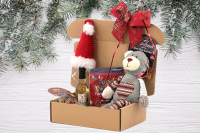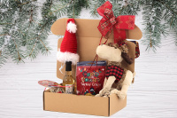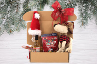 Velký vánoční box udělá radost malým i velkým psům – vedle velkého plyšového medvěda nebo soba obsahuje také legrační čepičku, nealko víno pro psy, oblíbenou žvýkací pochoutku a balíček extra chutných pamlsků z krůtího masa.
