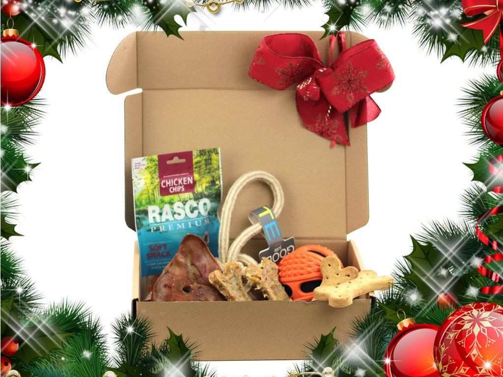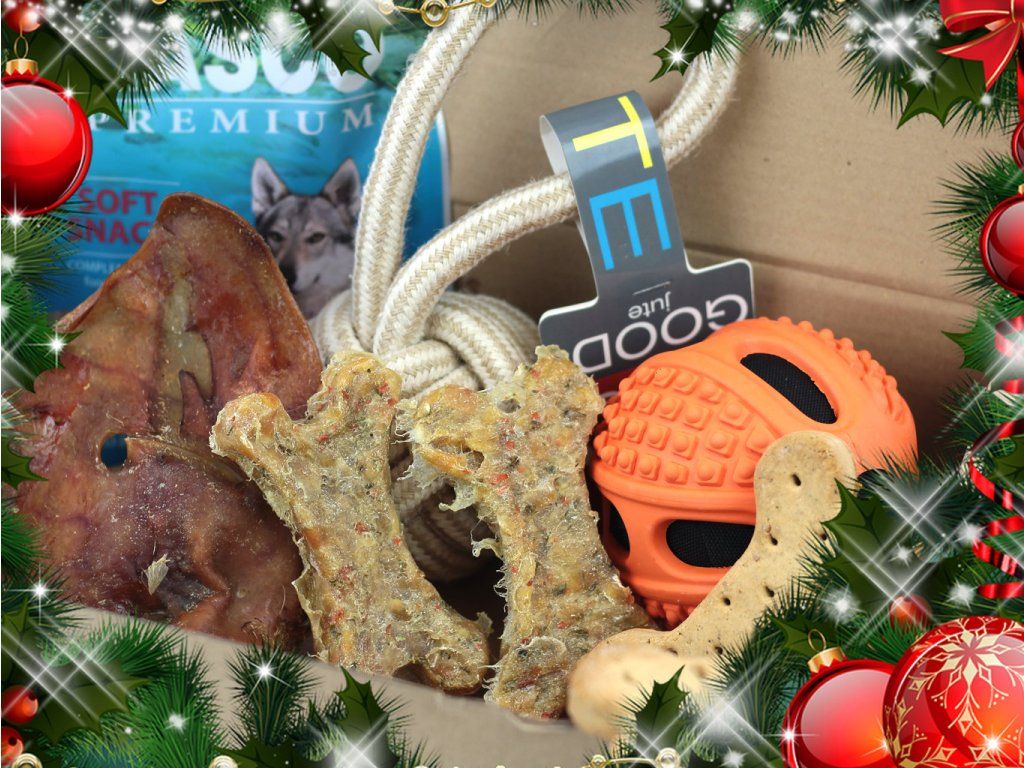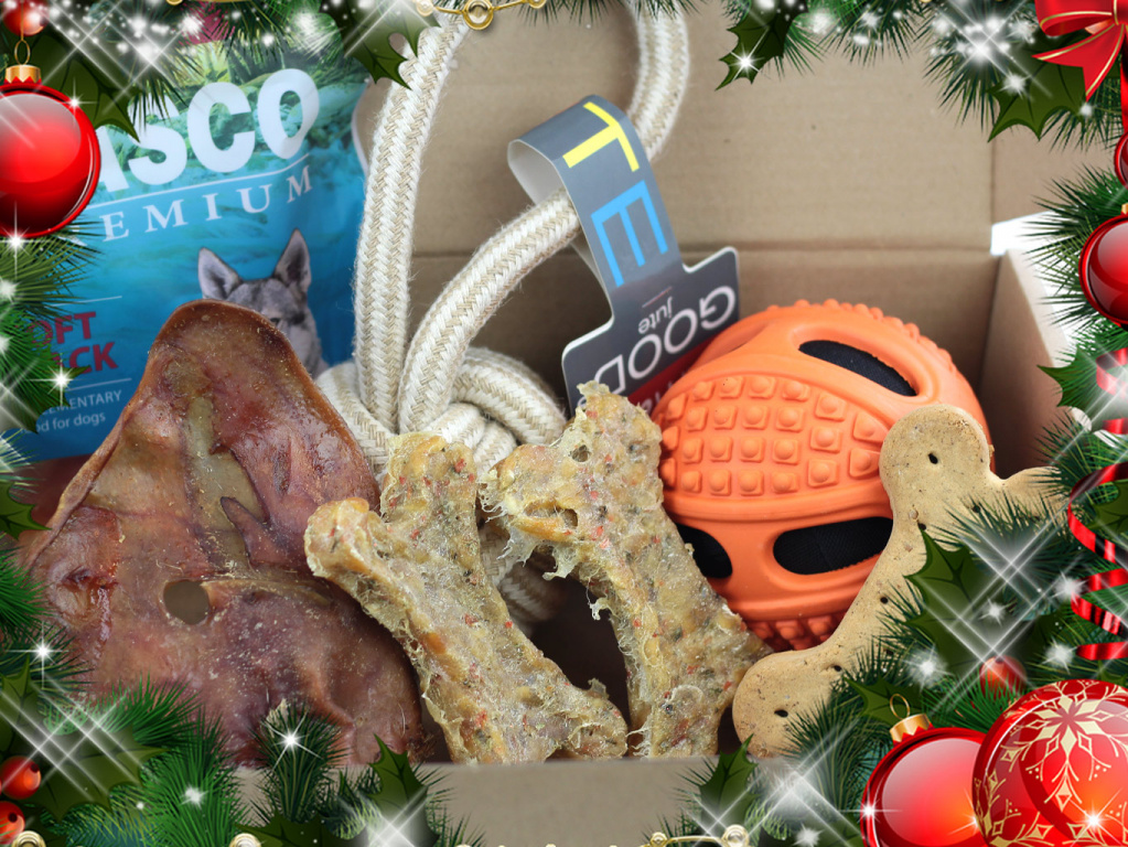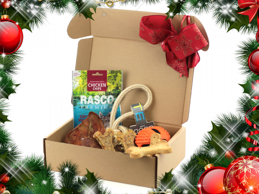Vánoční box pro velké psy obsahuje kromě těch nejvybranějších pamlsků a dobrot také jednu aportovací a jednu provazovou přetahovací hračku. Box je opatřen stylovou sváteční mašlí – stačí ho už jen schovat pod stromeček.