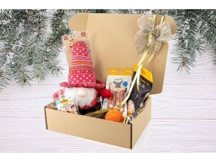 Vánoční box pro psy obsahuje kromě těch nejvybranějších pamlsků a dobrot hned dvě hračky – roztomilou plyšovou hračku dle vlastního výběru a provazovou přetahovací a kousací hračku. Box je opatřen stylovou sváteční mašlí – stačí ho už jen schovat pod stromeček.