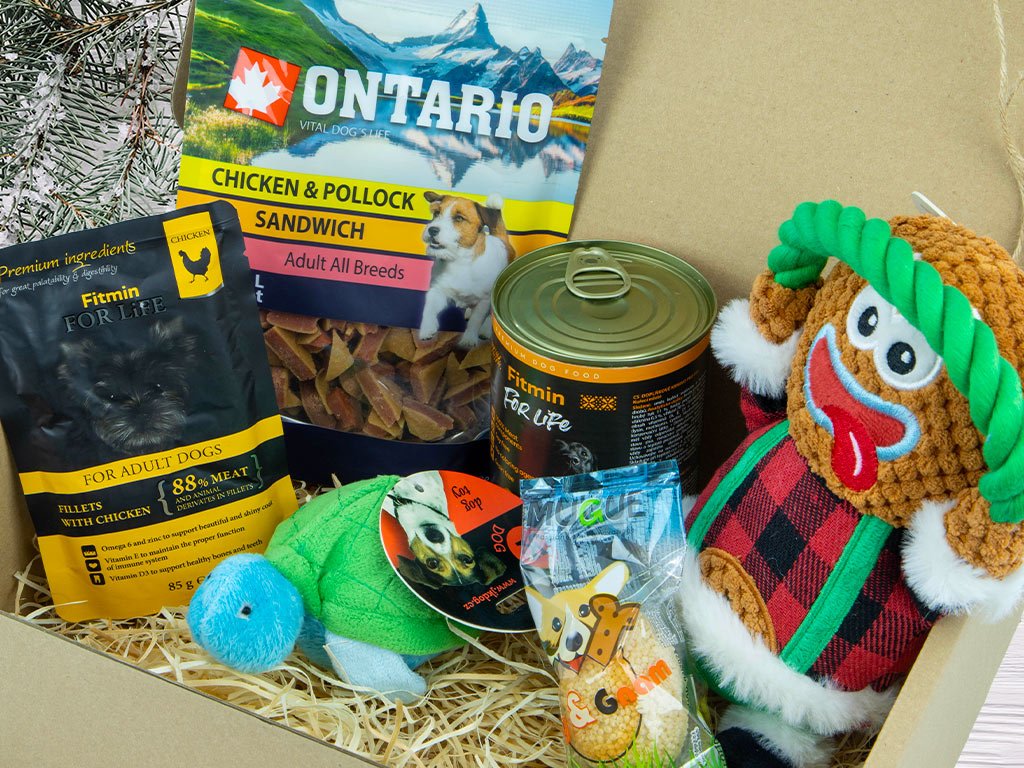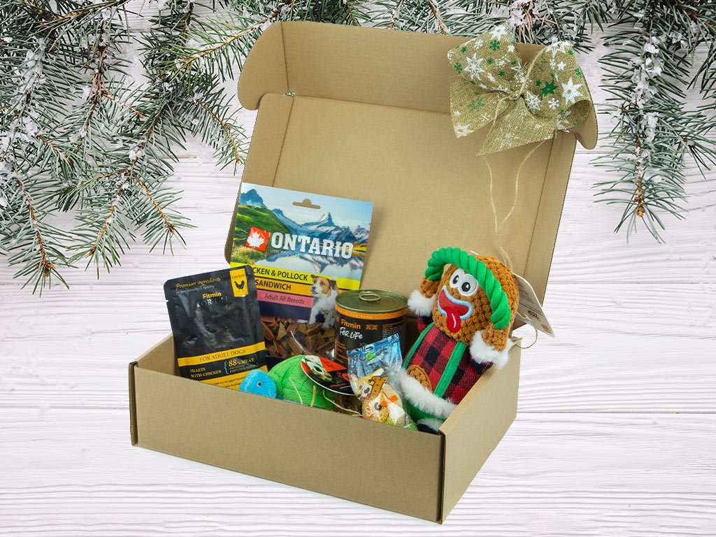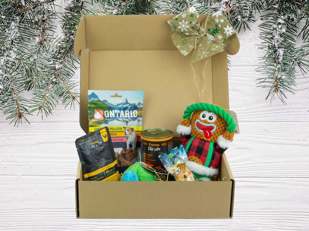 Dárek k Vánocům pro psy – box s pochoutkami a hračkami