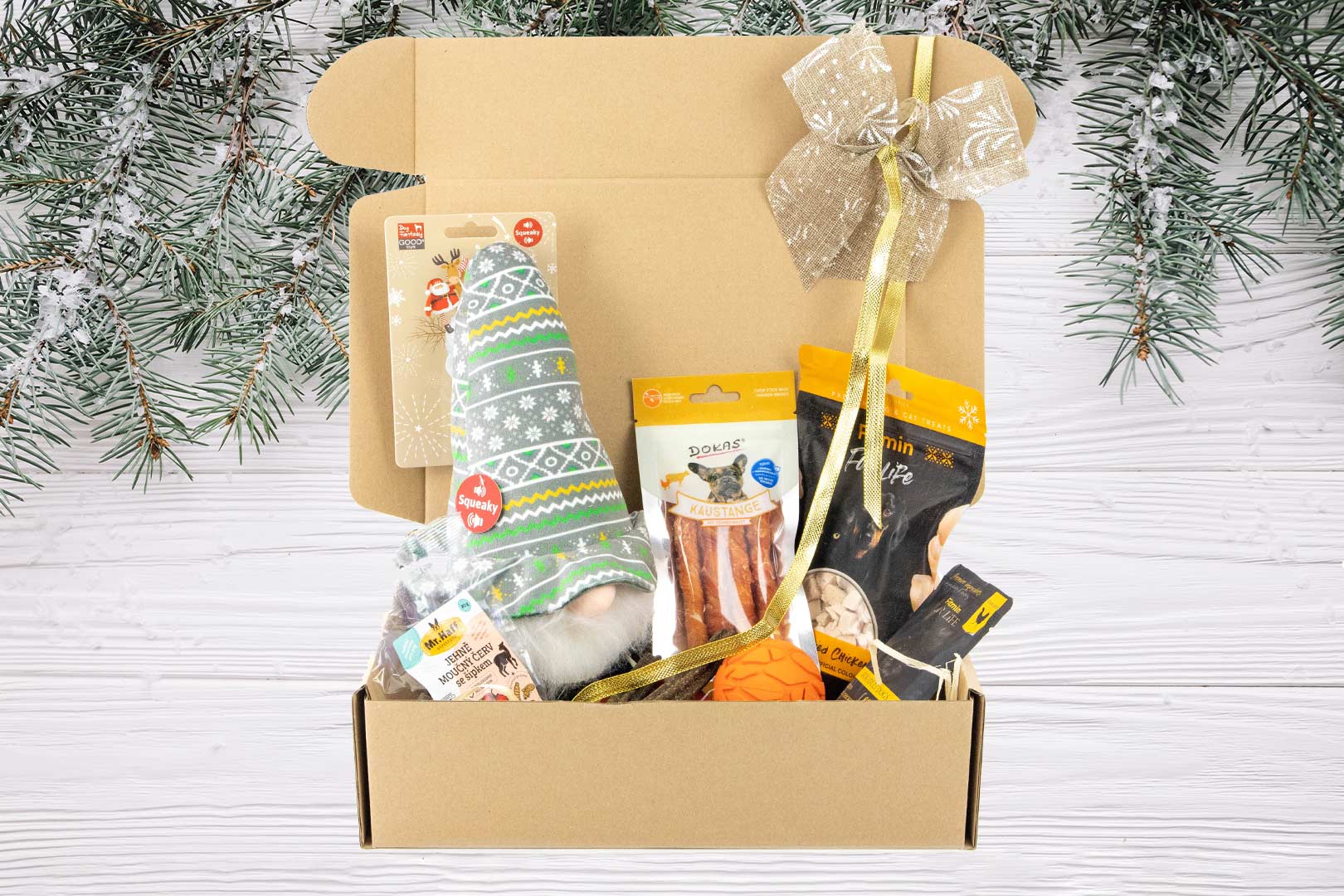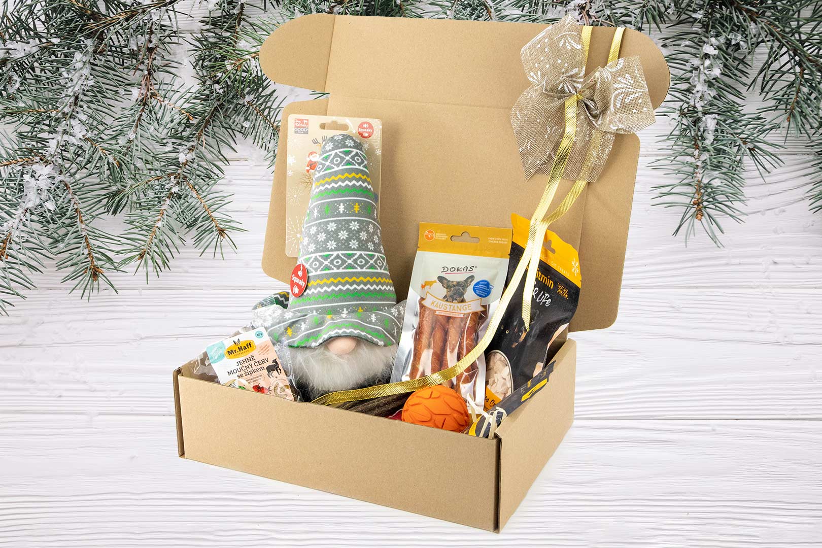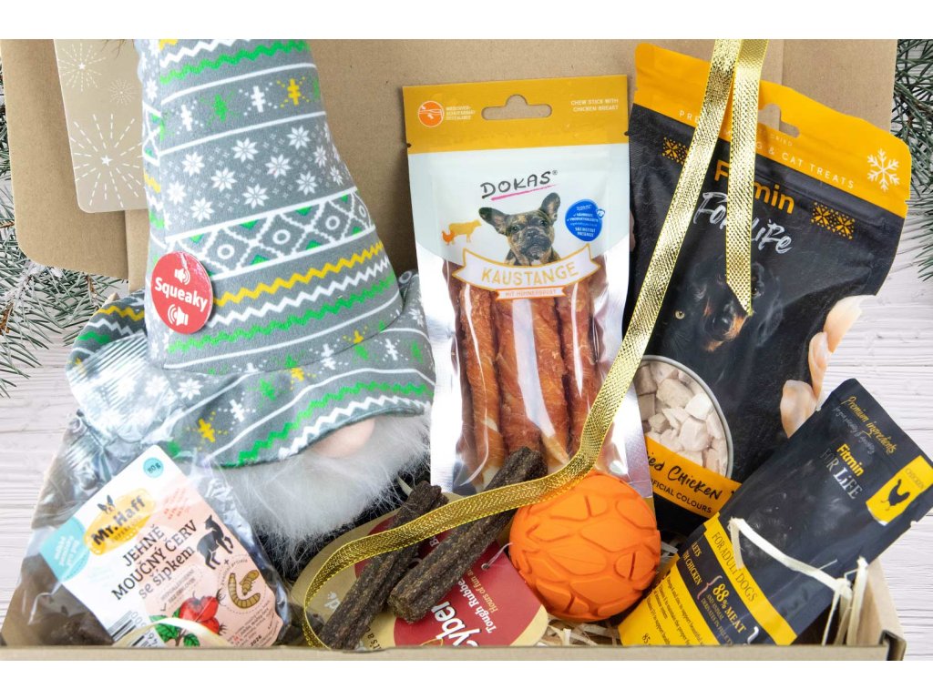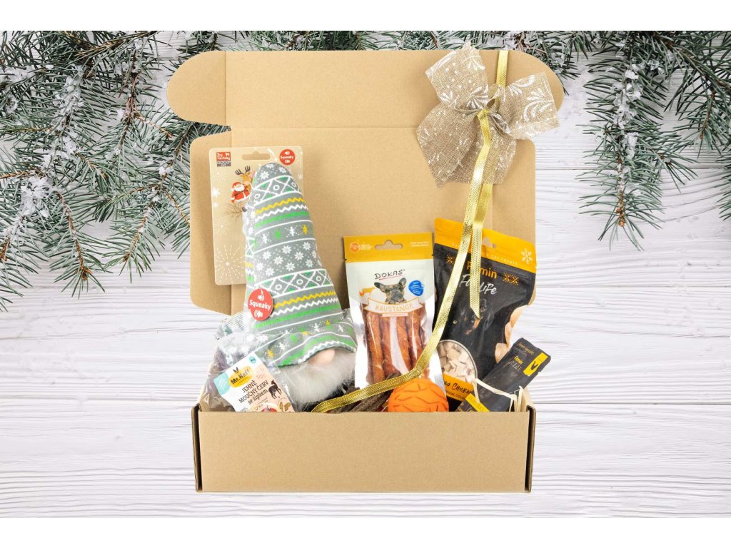 Vše je krásně zabalené a ozdobené sváteční mašlí – stačí položit pod stromeček a sledovat, jak váš pes s nadšením objevuje, co se uvnitř skrývá.