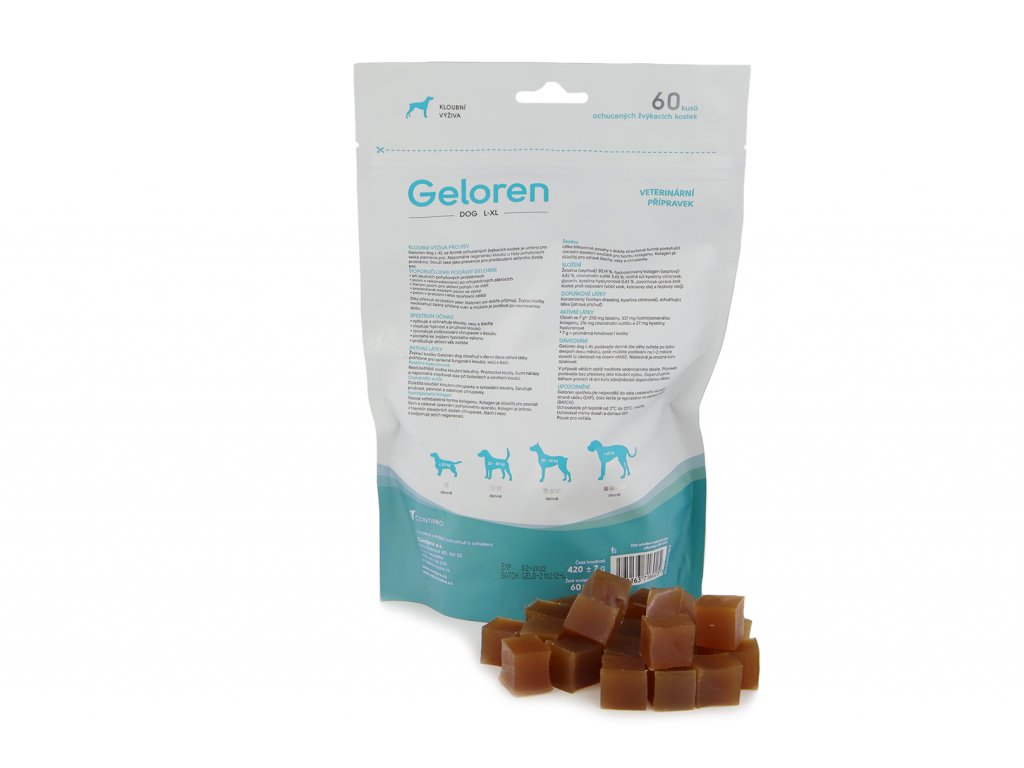 Želatinové tablety Geloren představují ideální řešení pro účinnou podporu pohybového aparátu vašich psů. Vedle blahodárných účinků na klouby, chrupavky, šlachy a vazy působí Geloren pozitivně i na kvalitu srsti, kůže a drápků. Pravidelným užíváním přispějete k dlouhému aktivnímu životu vašeho psa.